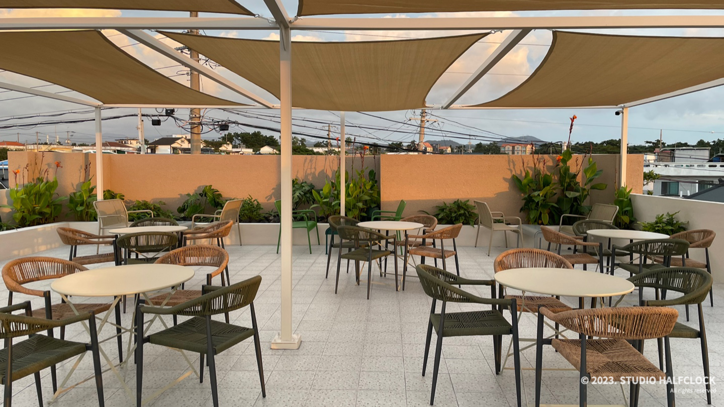 2층 테라스는 꽤 넓은데 여긴 가림막이 네모 모양이다. 공간에 따라서 다르게 한 듯..? 여기서는 노을을 보기에 정말 좋다.