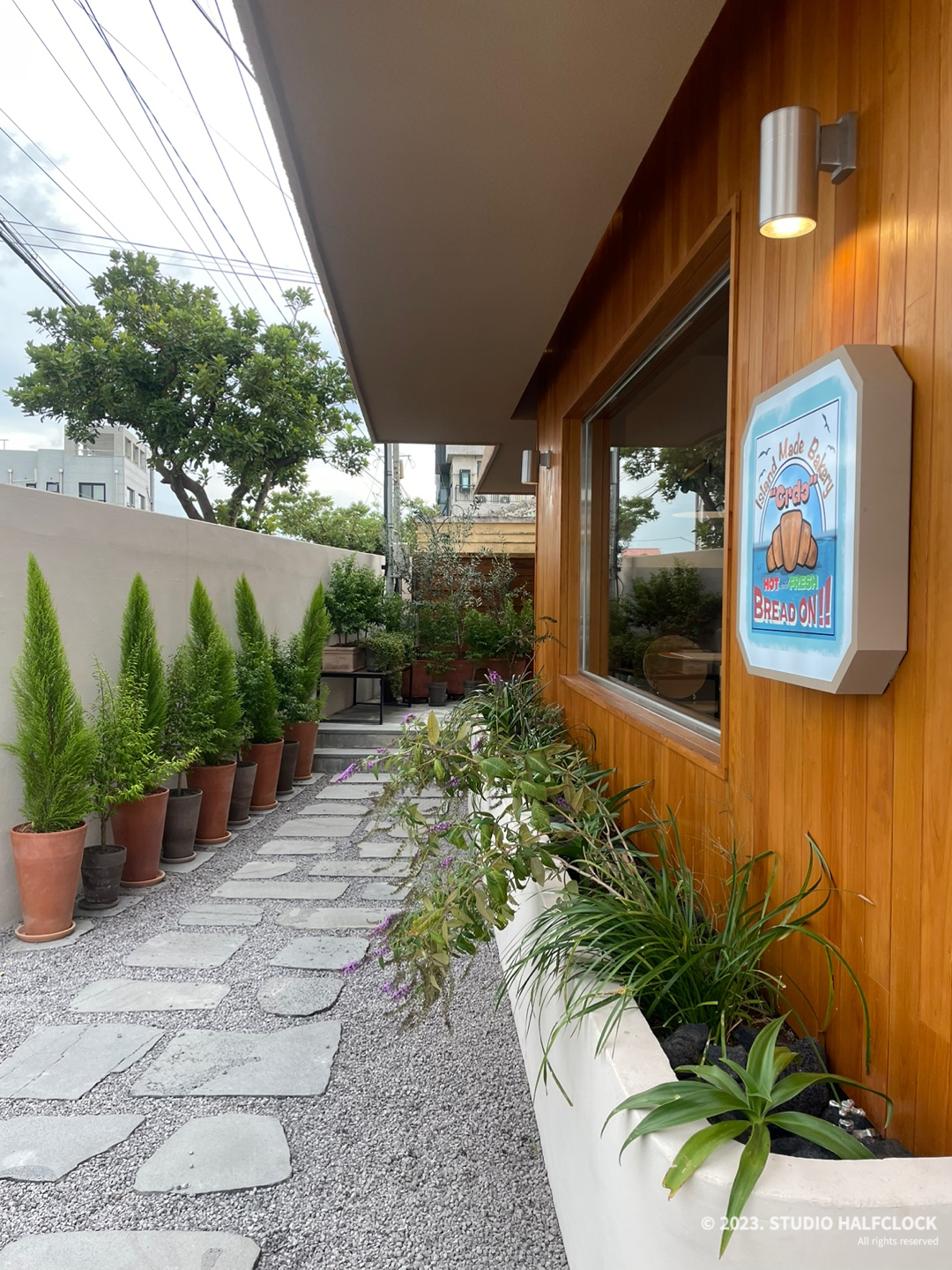 카페 크도, 안으로 길을 따라 걸어 들어가면 입구가 있다. 외관은 목재와 곳곳에 배치되어 있는 화분들로 자연친화적인 분위기를 줬다. 곳곳에 토분과 나무들은 편안한 느낌을 준다. 사실 도로 바로 앞에 위치해서 조금 개방적인 느낌일 것 같았는데 조금 높은 벽과 안쪽으로 들어가야 있는 출입구는 카페를 조금 프라이빗하게 만들었다.