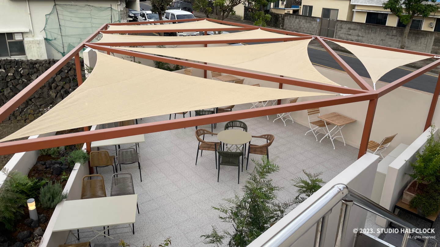 2층 테라스는 꽤 넓은데 여긴 가림막이 네모 모양이다. 공간에 따라서 다르게 한 듯..? 여기서는 노을을 보기에 정말 좋다.