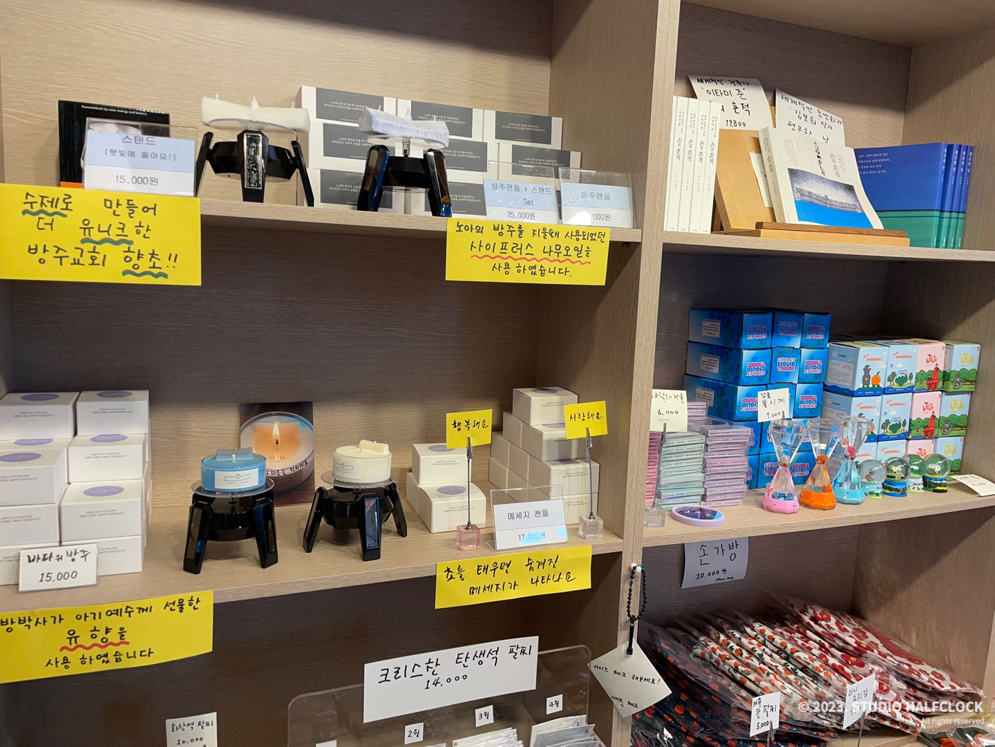 주차는 방문자 무료였어요. 제주도는 웬만하면 주차비를 안받는듯 합니다. 카페에서는 다양한 음료를 판매하고 추가로 방주교회 관련 굿즈를 판매하고 있었어요. 방주교회 캔들, 향초 등 다양한 굿즈가 있으니 볼만했습니다.