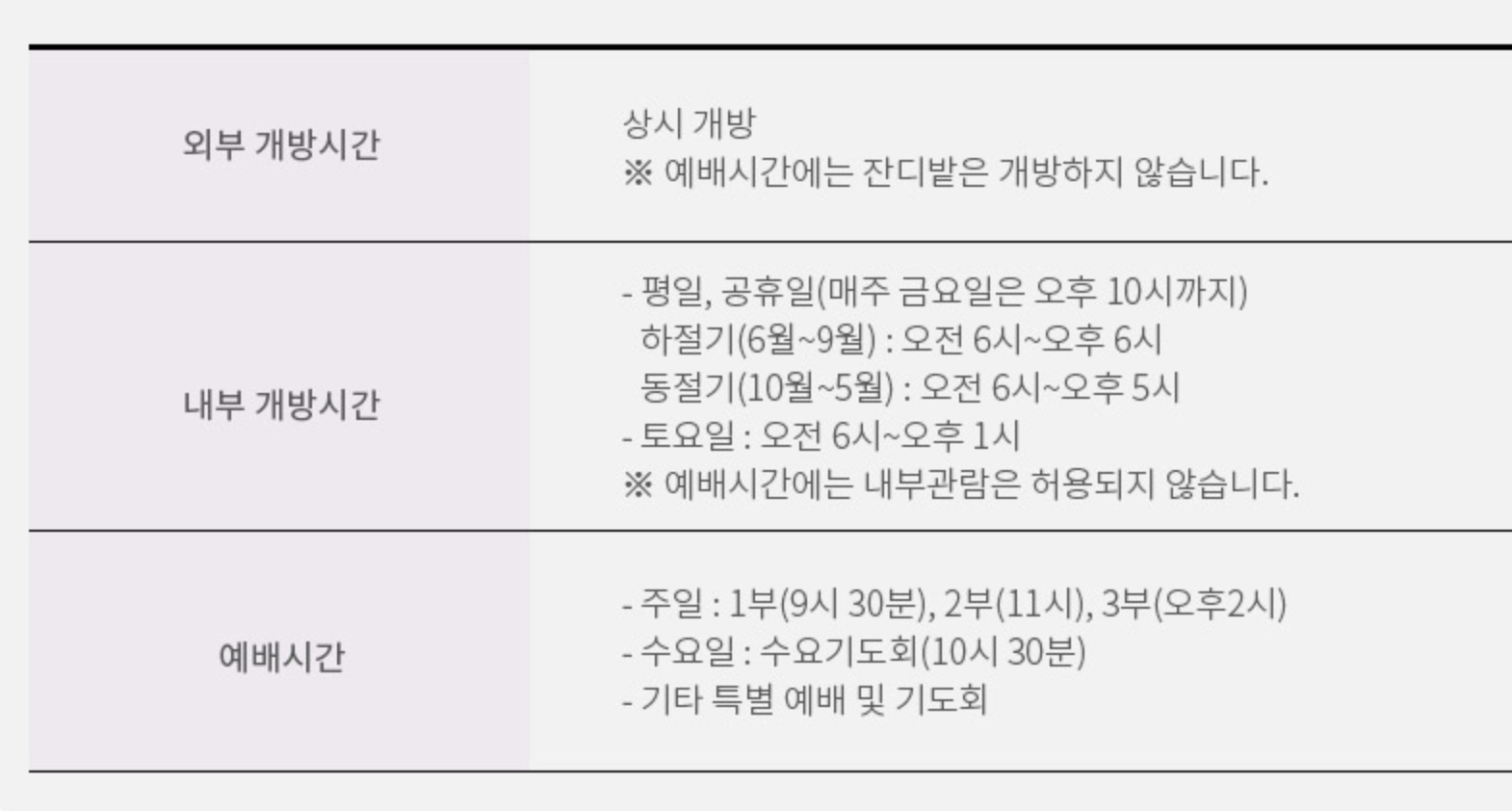 • 운영시간: 외부 상시 개방, 내부는 아래 이미지 참고