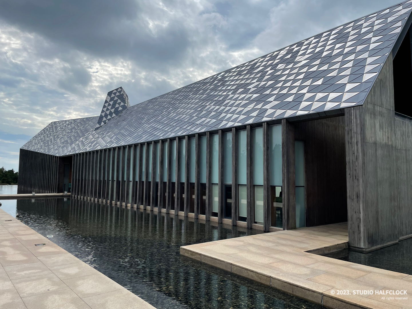건축물 지붕의 각도를 보면 양 끝이 올라가는 형태로 중심에서부터 높아지는 느낌이 있습니다. 유리에 세로로 나무 루버가 있어서 수직으로 조금 넓어보이는 효과가 있었습니다. 물 가운데를 가로질러 있는 입구로 들어가는 도보는 물을 가르고 방주 안으로 들어가는 느낌을 줍니다. 건축가가 설계할 때 많이 고민한 게 느껴지는 건축물. 이렇게 좋은 건축물들이 한국에 많아졌으면 좋겠습니다.