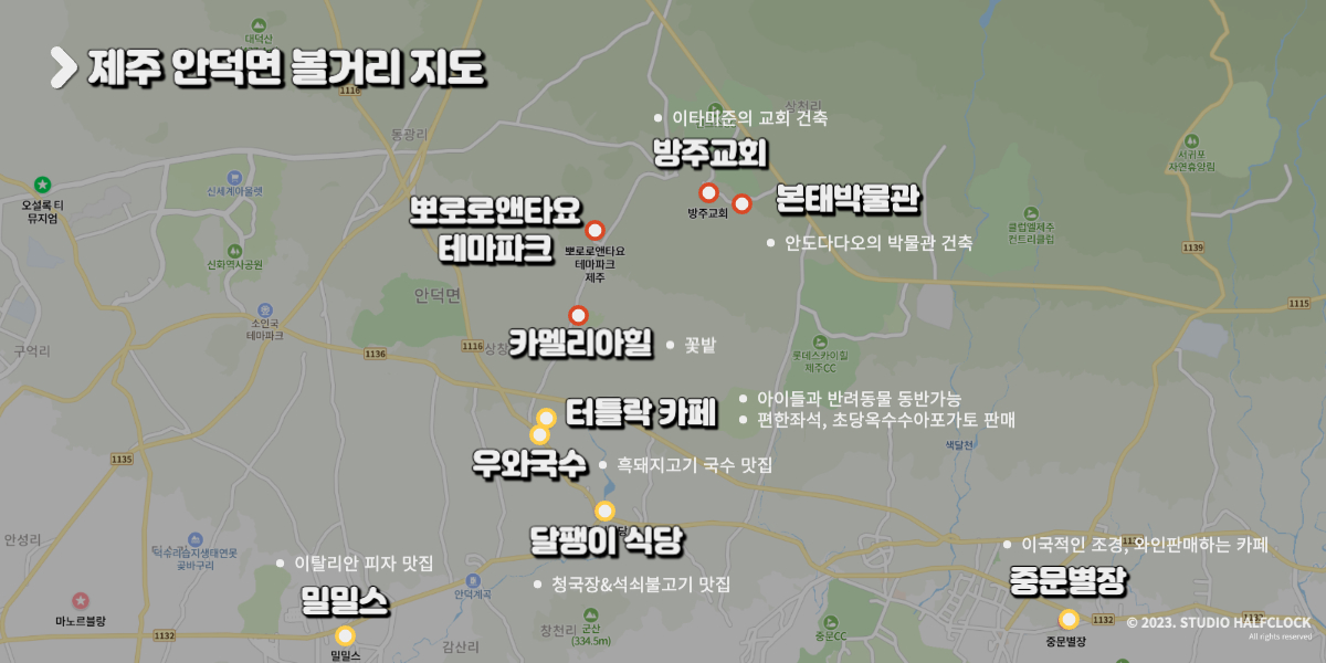 - 안덕면 볼거리: 방주교회, 본태박물관, 카멜리아힐, 뽀로로 앤 타요 테마파크