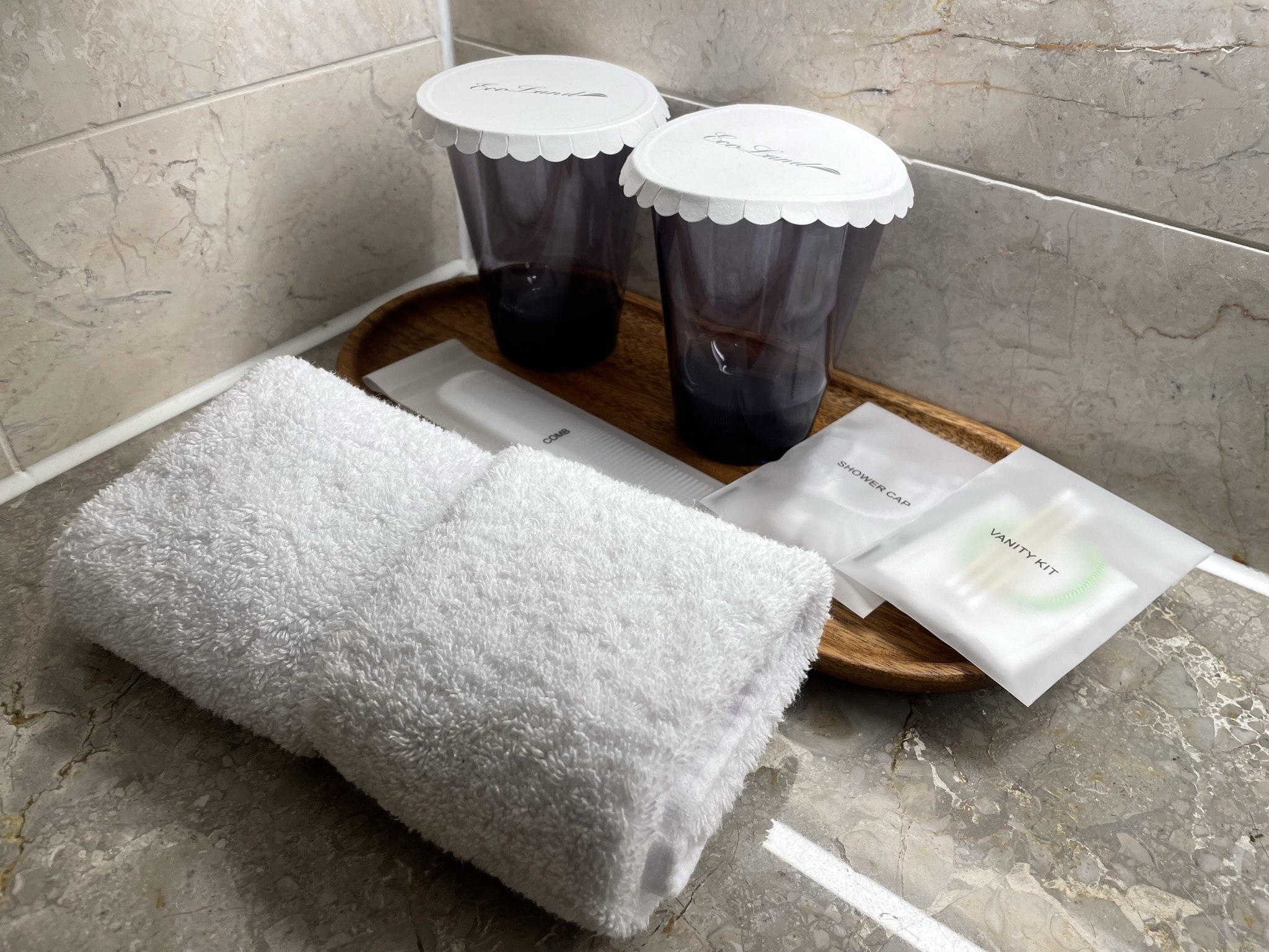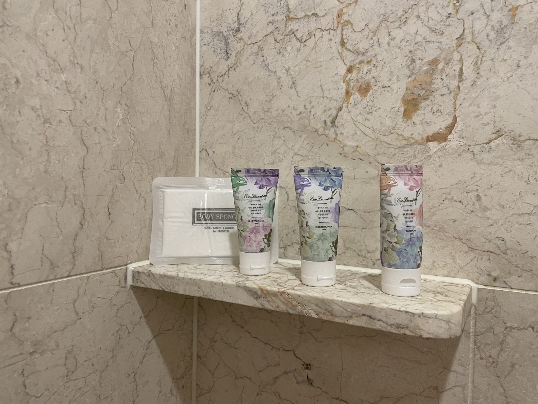 기본적인 샴푸, 린스, 바디워시가 있고 면봉 머리끈 화장솜 등 웬만한 건 다 있었다. 개인적으로 여기서 제공하는 비누가 향이 너무 좋아서 하나 사고 싶었다. 화장실 내부는 정말 깨끗하다. 칫솔을 제공하지 않기 때문에 개인 칫솔을 챙기겨야한다. 만약 챙기지 못했다면, 로비에서 계단으로 내려가는 곳이 있는데, 거기 있는 자판기에 칫솔을 판다.