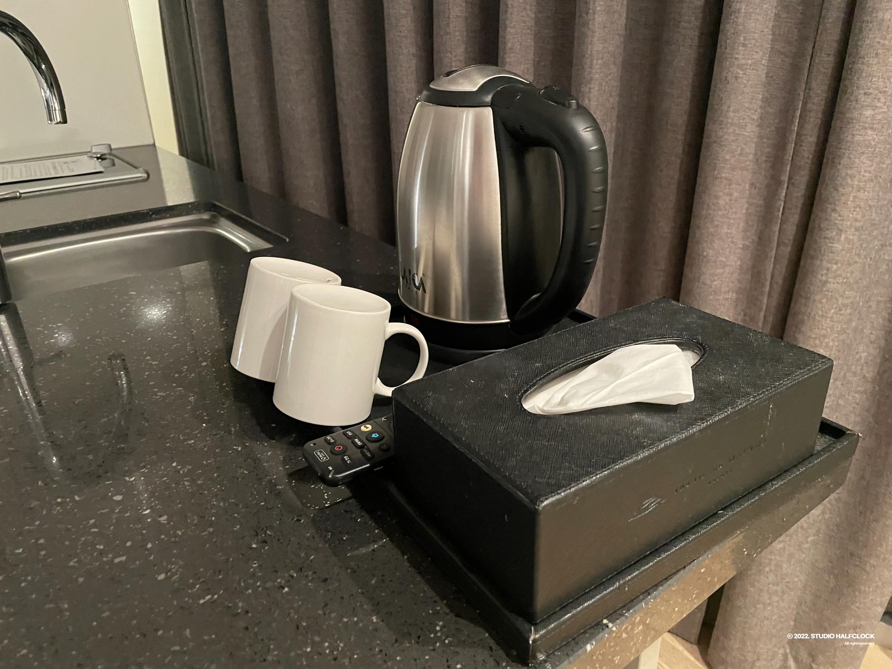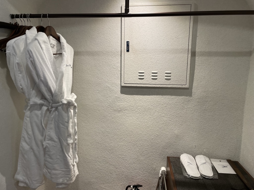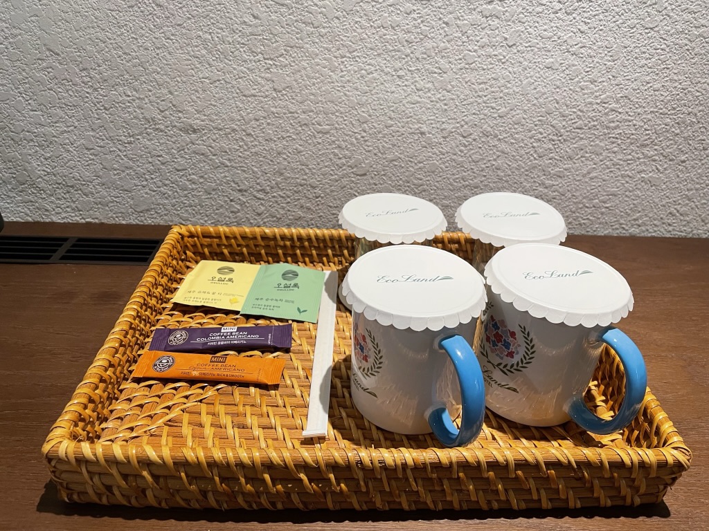수영장 갈 때 입을 가운이다. 두꺼워서 수건 같은 느낌이다. 무료 제공되는 차랑 커피다. 센스 있게 오설록 차를 구비해놓아 잘 마셨다.