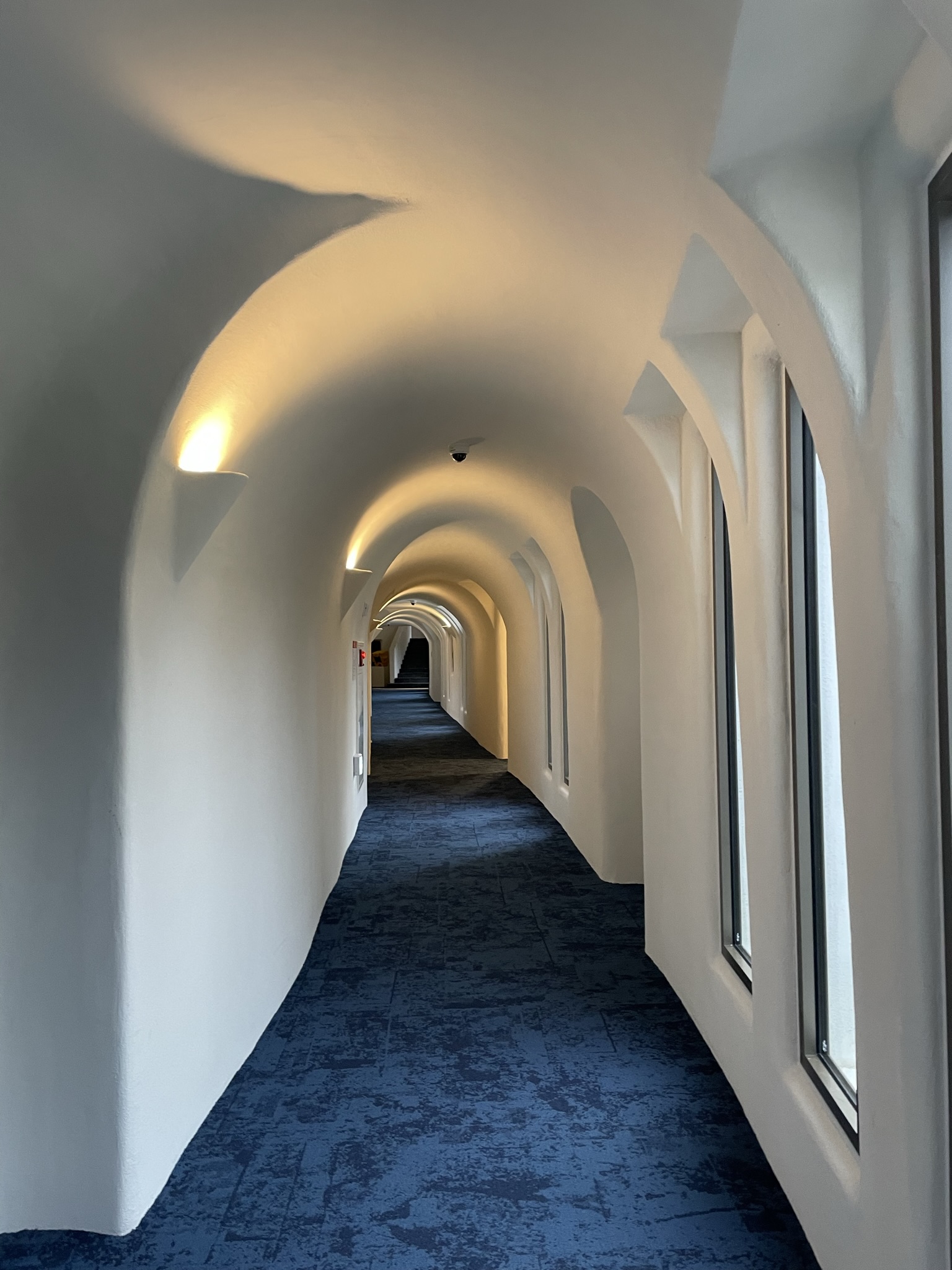 둥글둥글한 복도를 따라서 가다 보면 객실이 나온다. 호텔의 전체 분위기가 둥글둥글한 유럽식이라서 귀엽다. 벽은 대부분 화이트에 질감이 있는데 나중에 때가 잘 탈 것 같다.