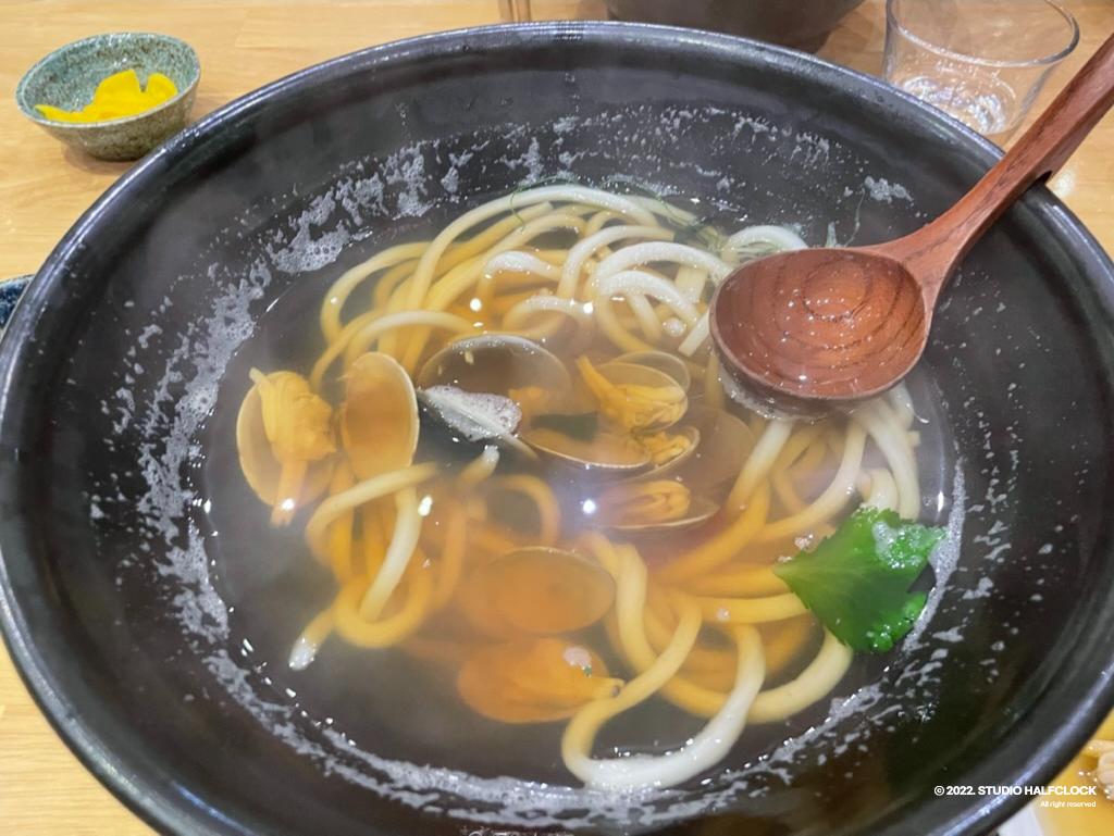 - 시킨 메뉴: 아사리(바지락)우동(₩10,000), 가마타바 버터 우동 (₩11,000)