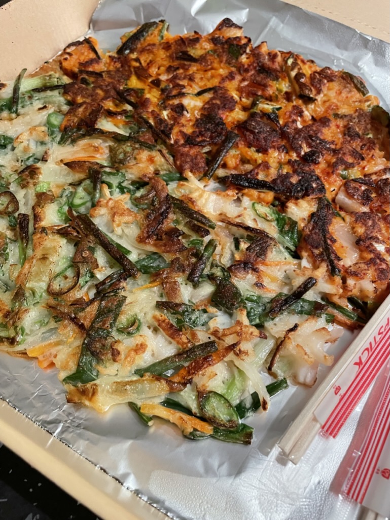 이 숙소 근처에 걸어서 갈 수 있는 식당이 많아서 야식을 걸어가서 사 올 수 있어서 좋았다. 심지어 늦게까지 운영하는 식당이 많았다. 근처 돌아다니다가 맛있어 보이는 식당 발견! 술은 안 먹지만 안주는 좋아하니깐 가서 파전만 테이크아웃해왔다. 파전이 해물과 김치 파전 반반인데 무슨 피자처럼 포장해주셨다. 가격은 15,000원이고 굉장히 푸짐했다. 진짜 너무 맛있어서 즉흥적으로 고른 식당치고 굉장히 만족했다. 전이 너무 두껍지 않아서 밀가루 맛이 나지 않았고, 겉은 바삭하게 잘 구워졌는데 속은 촉촉한 아주 맛있는 전이였다. 감자전도 팔던데 그것도 먹어보고 싶었지만 아쉬웠다. 포장은 전만 가능하다고 한다.