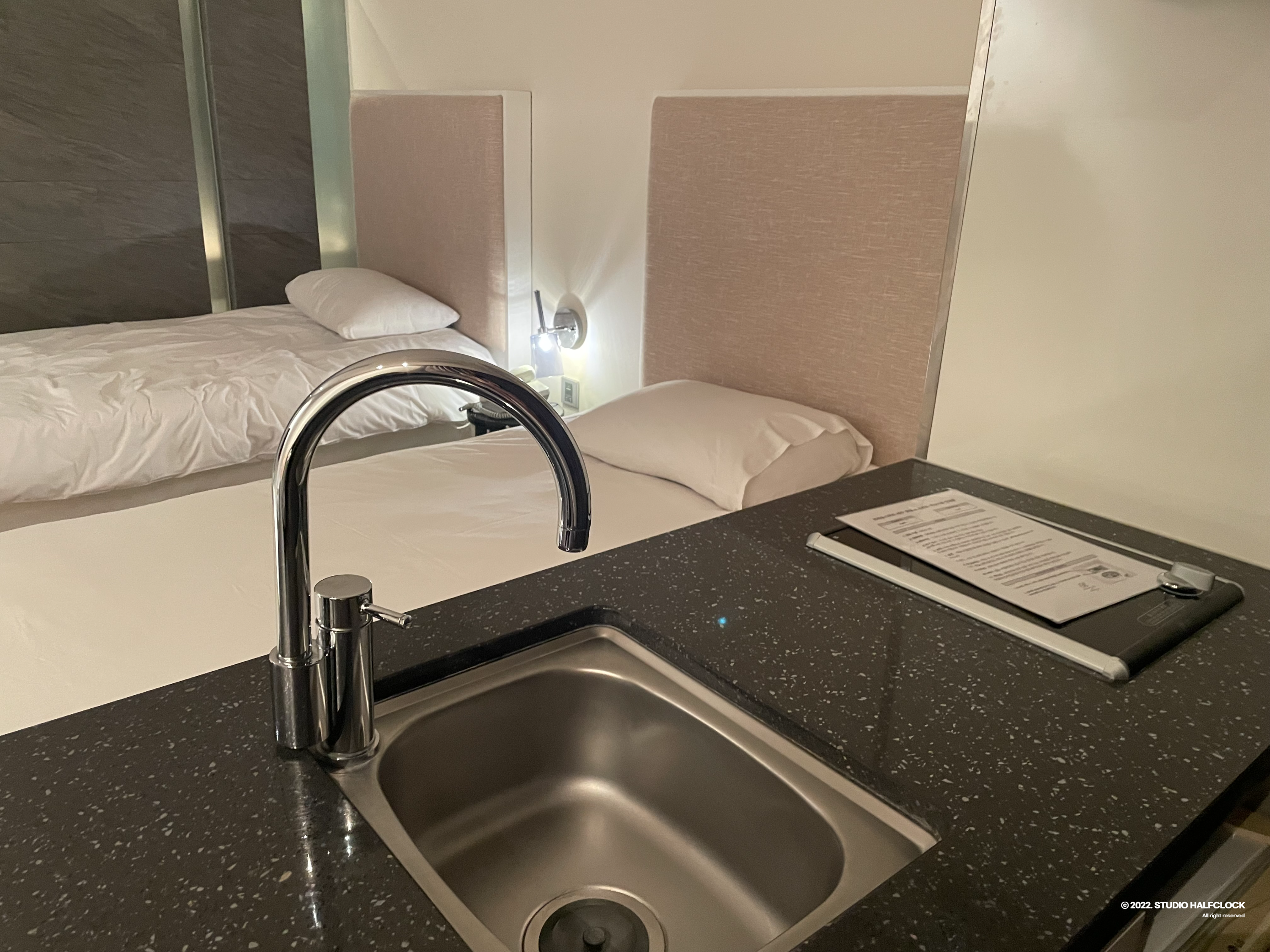 미니 냉장고 있고 싱크대와 인덕션, 후드도 있던데 조리는 화재 문제로 사용 불가라고 한다. 조리기구가 있는 걸 보면 원룸 같긴 했다. 사실 복도만 보더라도 좀 오피스텔 느낌이 있긴 하다.