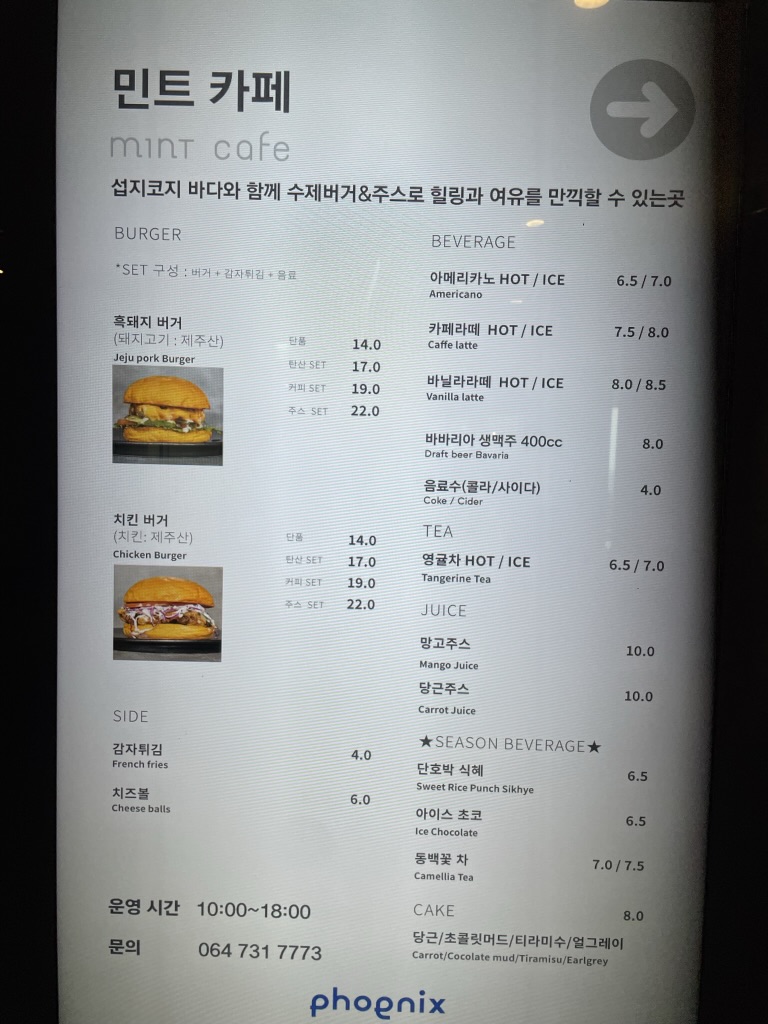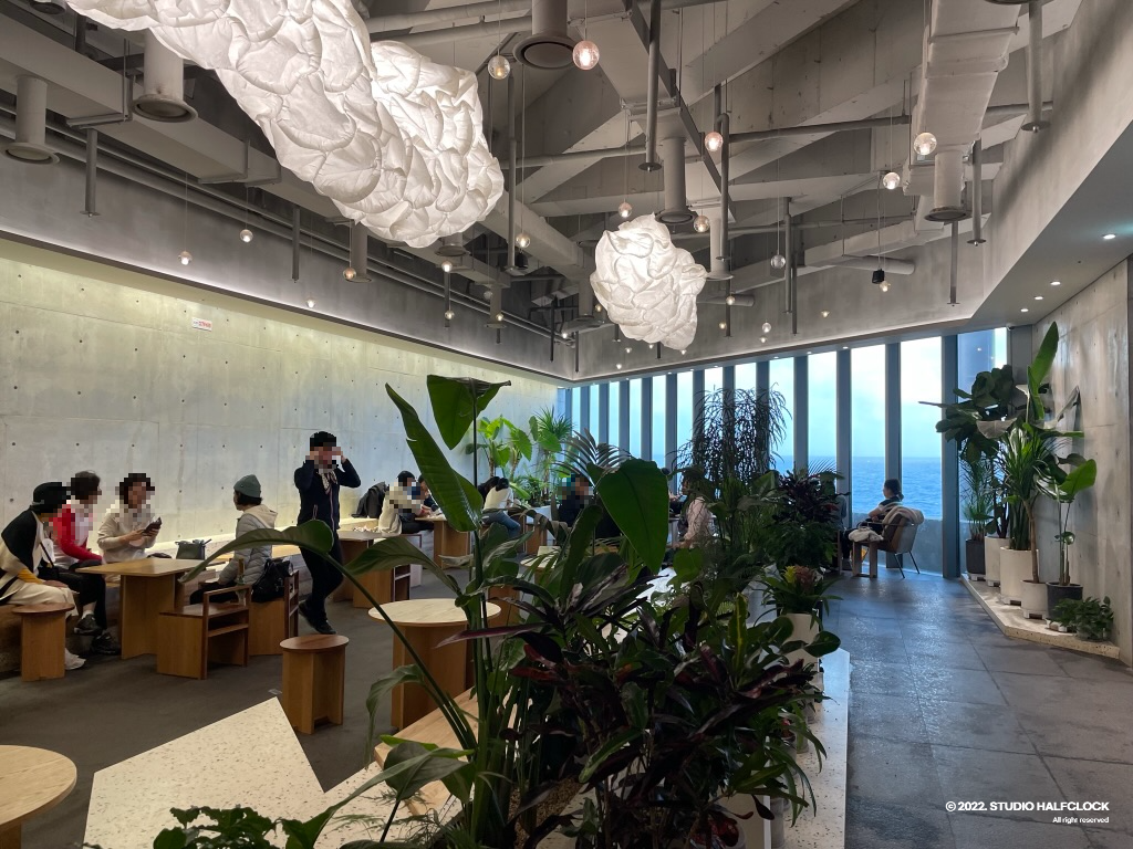잠깐 앉아서 커피를 마시며 섭지코지 바다를 구경할 수 있다. 점심에 흑돼지 버거를 팔고 저녁에는 팔지 않으니 참고하길 바란다. 내부 역시 노출 콘크리트로 되어 있는데, 밝은 조명으로 깔끔한 느낌을 준다.