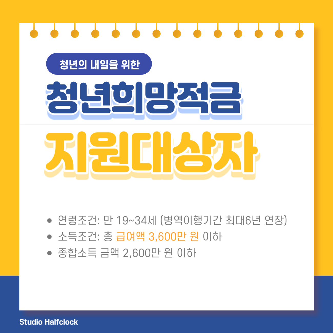 - 지원대상: 19~34세 청년 중에서 총 급여 3,600만 원 (종합소득 2,600만 원) 이하