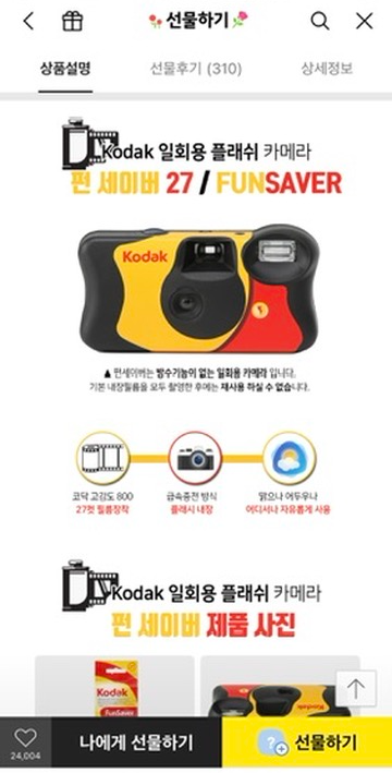 카카오 선물하기에 있는데요, 저는 코닥 일회용 플래쉬 카메라 펀 세이버 27컷 선물받았습니다. '일회용'이라서 쓰고 끝나는 거라 사진 찍을 때 신중하게 찍었어요. 가격도 부담스럽지 않아서 여행 갈 때마다 사갈 듯..?