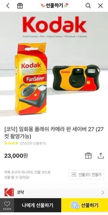 카카오 선물하기에 있는데요, 저는 코닥 일회용 플래쉬 카메라 펀 세이버 27컷 선물받았습니다. '일회용'이라서 쓰고 끝나는 거라 사진 찍을 때 신중하게 찍었어요. 가격도 부담스럽지 않아서 여행 갈 때마다 사갈 듯..?
