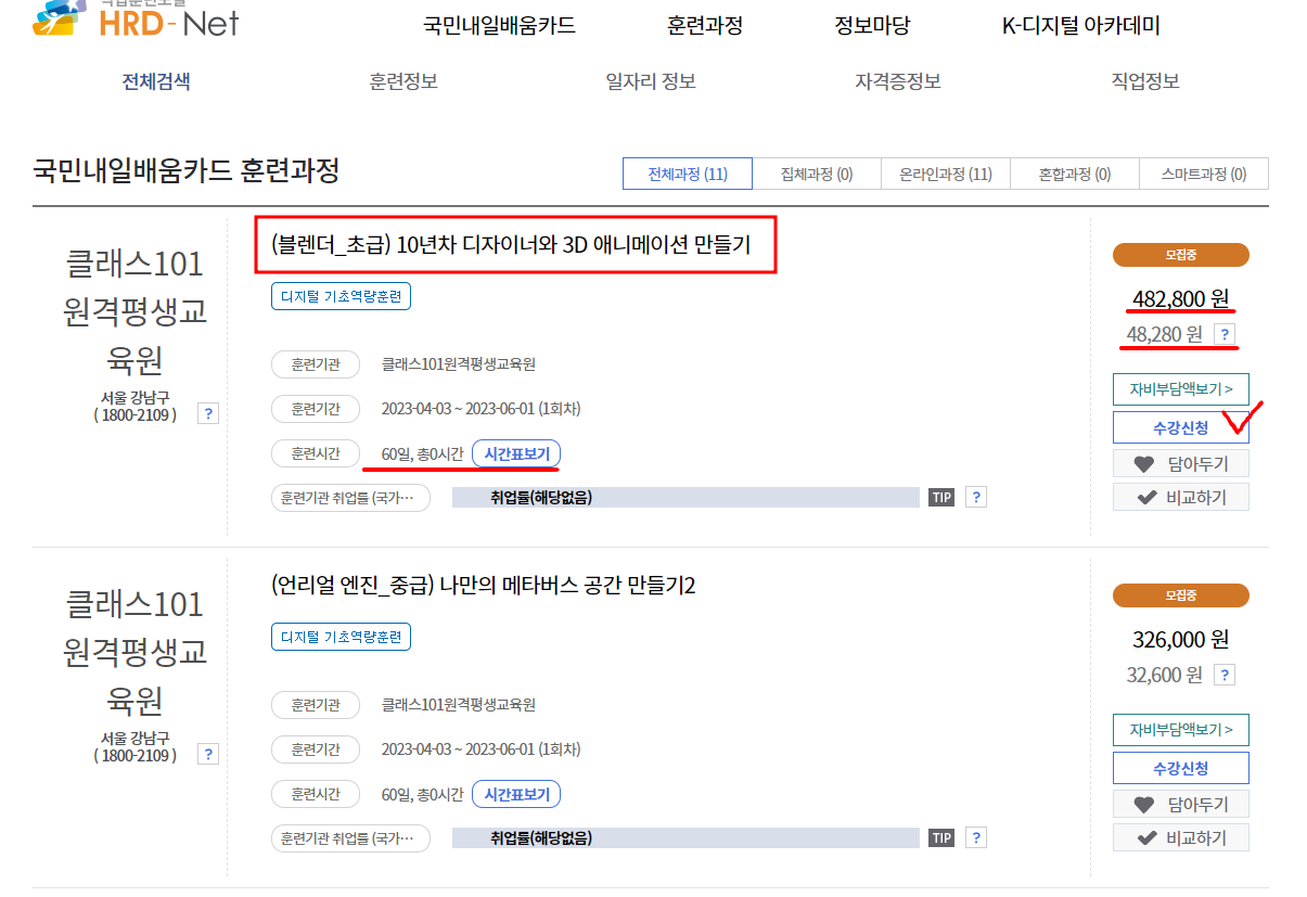 오른쪽에 보시면 강의료 482,800원, 자부담금 48,280원 적혀있습니다. (강의료마다 다릅니다)
