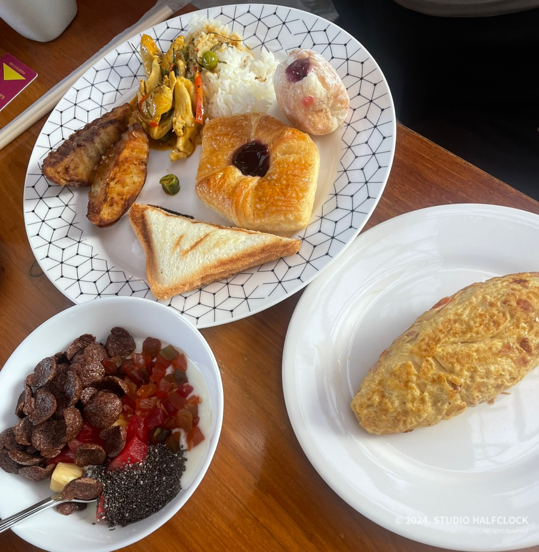 조식 먹는 곳은 2층으로 수영장뷰다. 조식은 뷔페식인데 나름 알차긴 했지만 막 엄청 종류가 많고 그렇진 않았어요. 김치도 있었음! 저녁에 찍어놓은 사진밖에 없는데 수영장뷰가 꽤 볼만합니다. 여기서는 점심, 저녁은 음식 주문해서 먹을 수 있어요. 디저트 과일에 스티키 망고 나왔는데 제스타일은 아니었던..