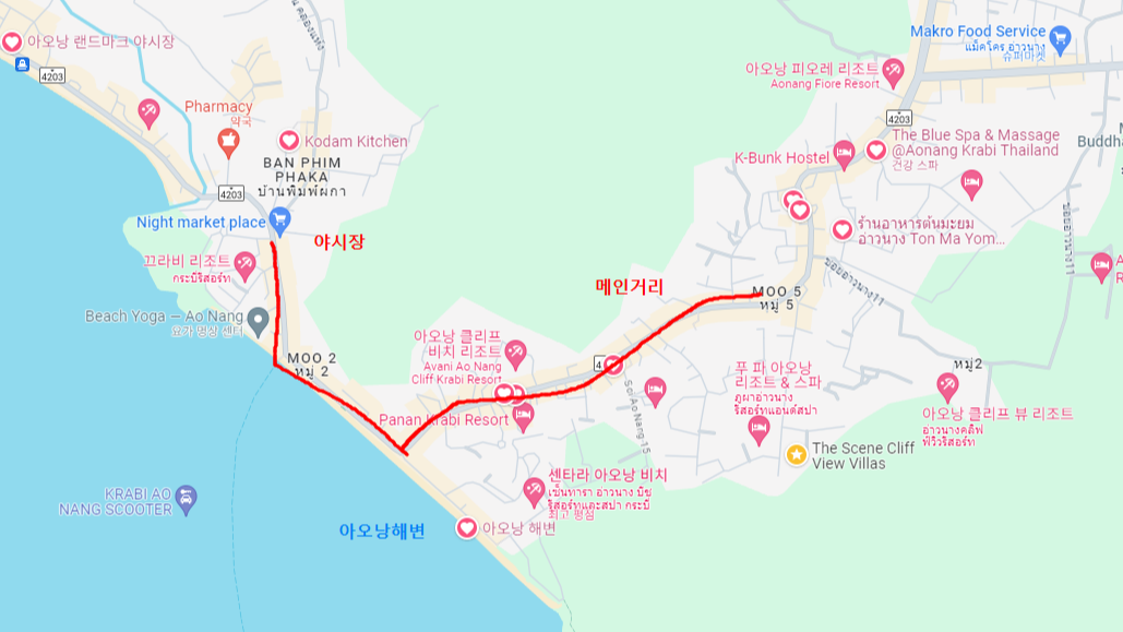 끄라비가 생각보다 동네가 정말 작습니다!!! 그래서 택시보다는 오토바이로 이동하는 경우가 많아요. (그랩도 오토바이가 더 잘 잡힙니다.) 그렇기에 오토바이를 렌트해서 쓰지 않는 이상 도보로 이동하는 경우가 많습니다. (걸어서 5~10분 거리가 많음) 아무튼 그 정도로 작은 마을인데 제가 숙소를 메인거리에서 떨어진 곳에 잡아서 정말 불편했습니다..^^..
