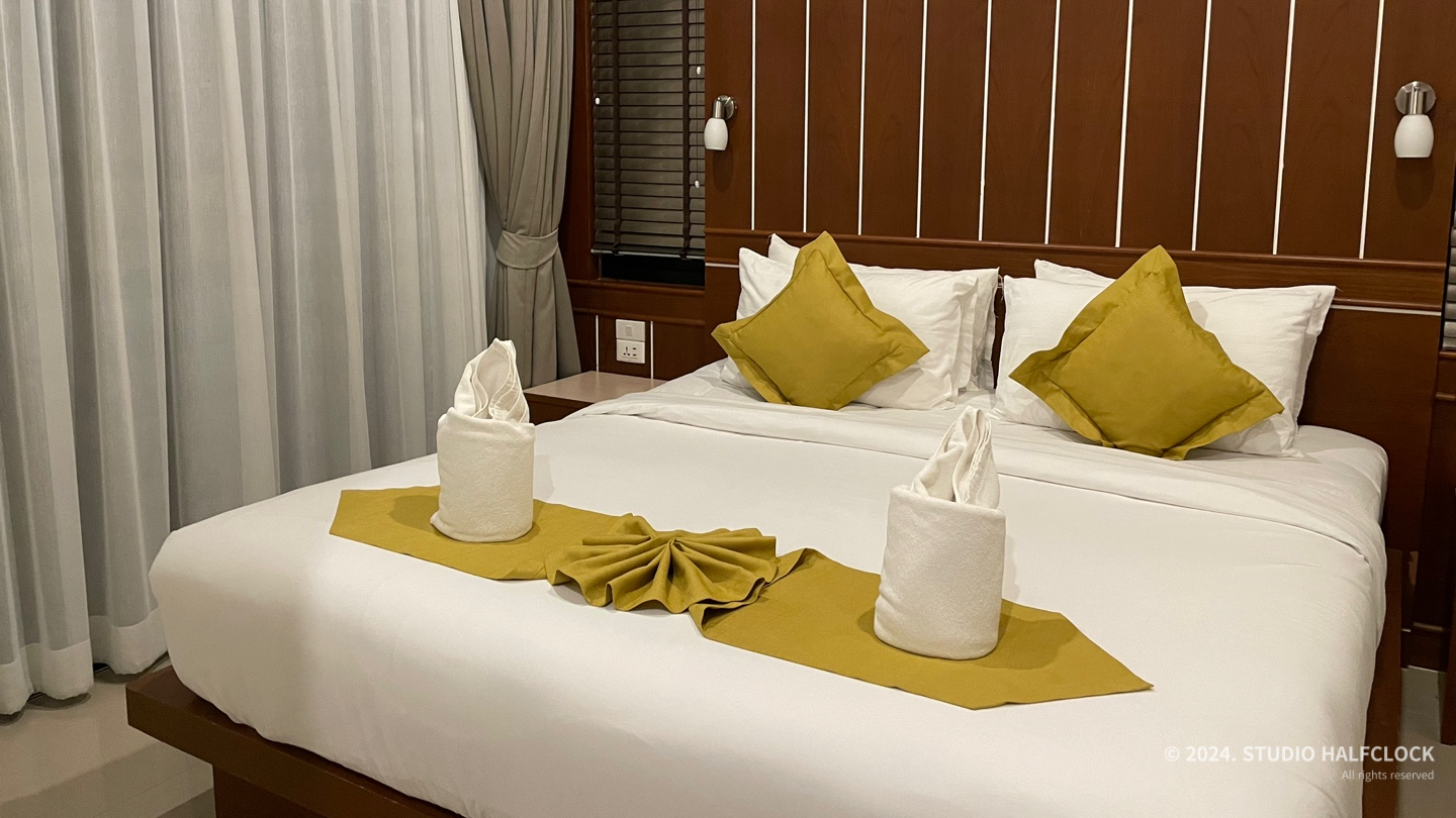 룸은 빌라형태로 되어있어서 일반 호텔룸보다 조금 크게 느껴졌어요. 킹베드를 선택했는데 여자 둘이서 자기에 꽤 넓었습니다. 매트리스가 너무 푹신하지 않아서 허리가 안 아파서 좋았어요. 룸 컨디션은 좋은 편이었습니다. 에어컨은 거실 쪽 하나랑 침대방에 하나 이렇게 두 개 있어요.