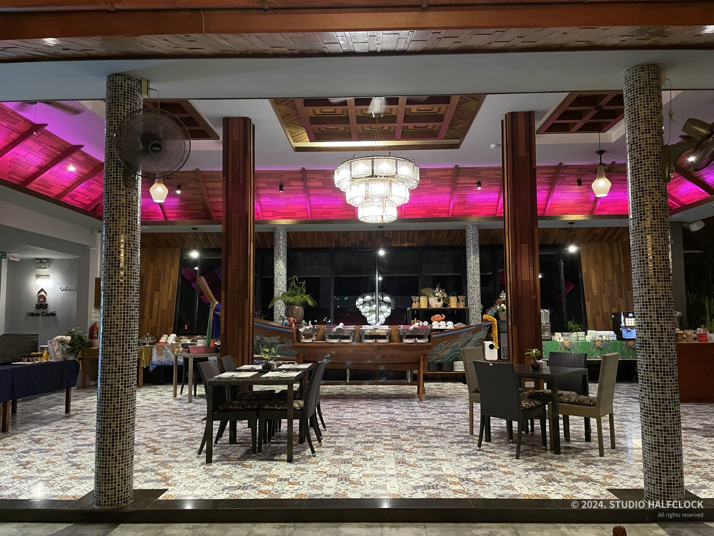 조식 먹는 곳은 2층으로 수영장뷰다. 조식은 뷔페식인데 나름 알차긴 했지만 막 엄청 종류가 많고 그렇진 않았어요. 김치도 있었음! 저녁에 찍어놓은 사진밖에 없는데 수영장뷰가 꽤 볼만합니다. 여기서는 점심, 저녁은 음식 주문해서 먹을 수 있어요. 디저트 과일에 스티키 망고 나왔는데 제스타일은 아니었던..