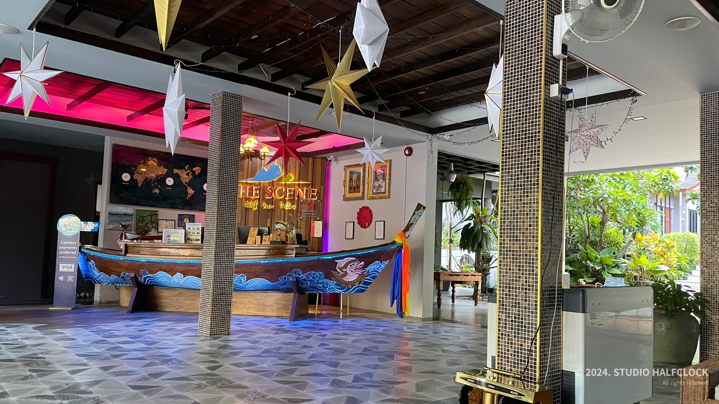 끄라비 공항에서 끄라비 시내까지는 그랩을 이용하는 게 제일 낫다. 괜히 공항 앞에서 호객행위하는 택시 잘못 타면 호구 잡힐 수 있다는 후기가 있어서 그냥 그랩어플 이용해서 택시를 탔다. 태국느낌 물씬 나는 리셉션!