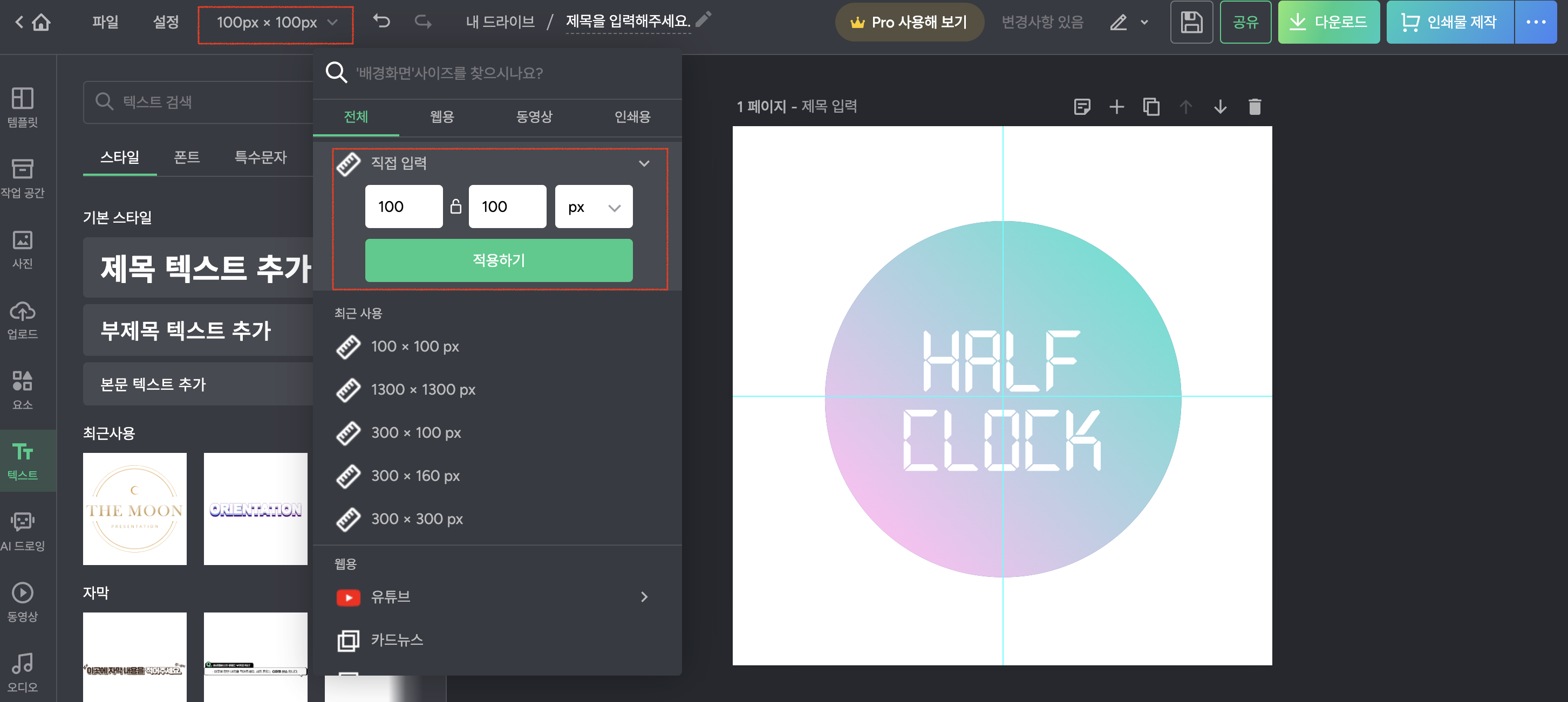미리캔버스에 들어가서 100px X 100px짜리 페이지를 만들어 줍니다. (150x150도 괜찮)