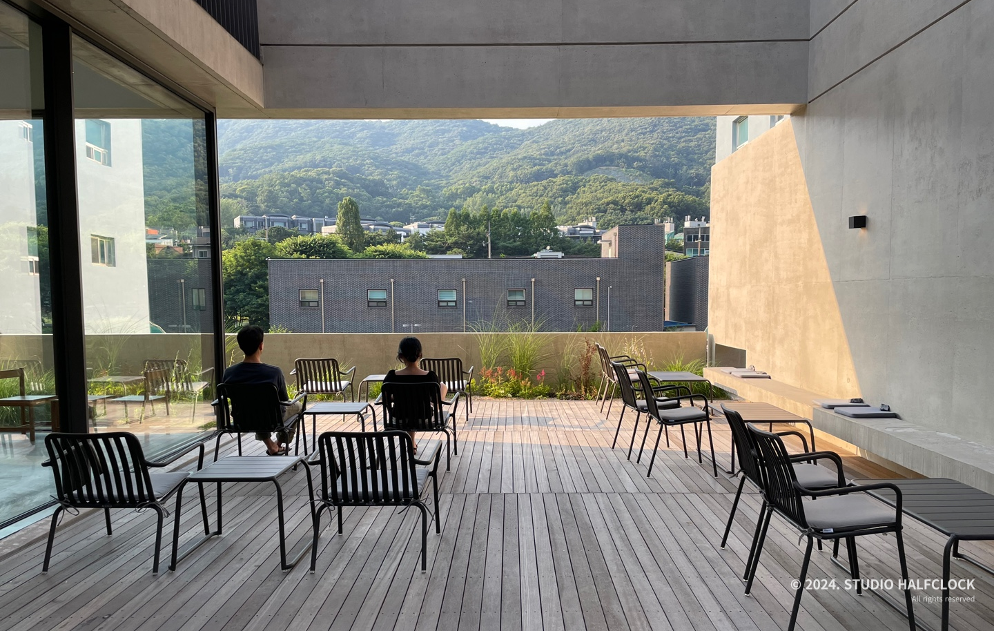 날씨 좋을 때, 외부 테라스에 앉아서 커피를 마시며 뷰를 보는 것도 추천! 저 멀리 산이 보이는데, 한적한 분위기 동네라서 마음이 안정되는 느낌이었습니다.