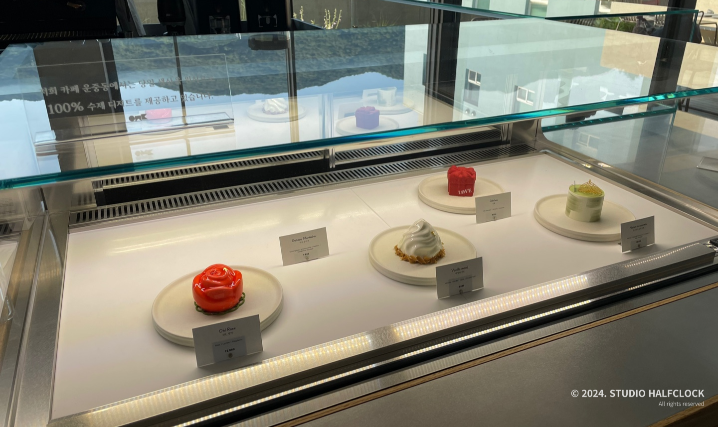 너무 예뻐서 먹기 아까운 디저트들이 있는데, 배불러서 못 먹었지만 언제 한번 다시 와서 먹어보고 싶네요. 디저트는 당일 생산으로 100% 수제 디저트를 제공한다고 합니다.