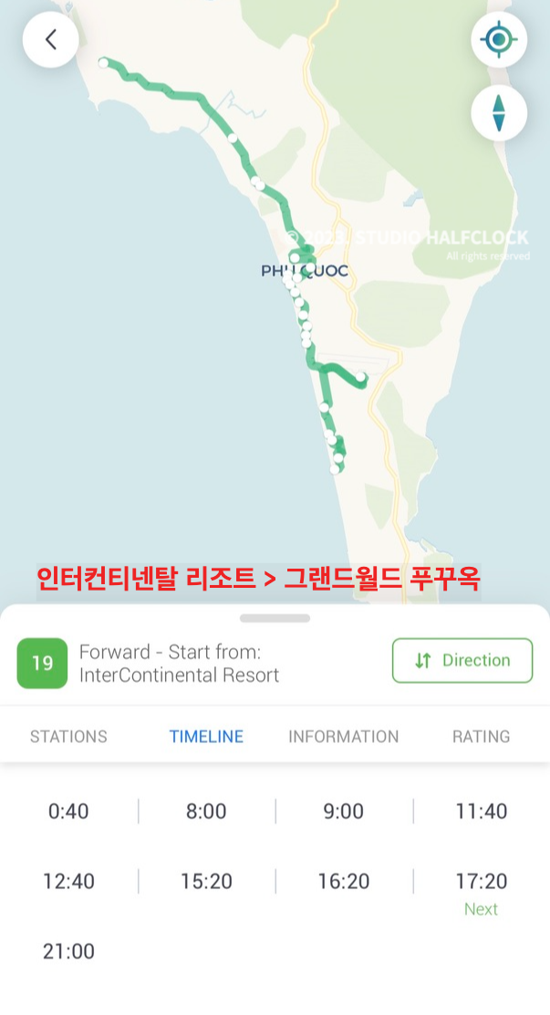 - 인터컨티넨탈 리조트에서 그랜드월드 푸꾸옥: 0:40, 8:00, 9:00, 11:40, 12:40, 15:20, 16:20, 17:20, 21:00 (막차)