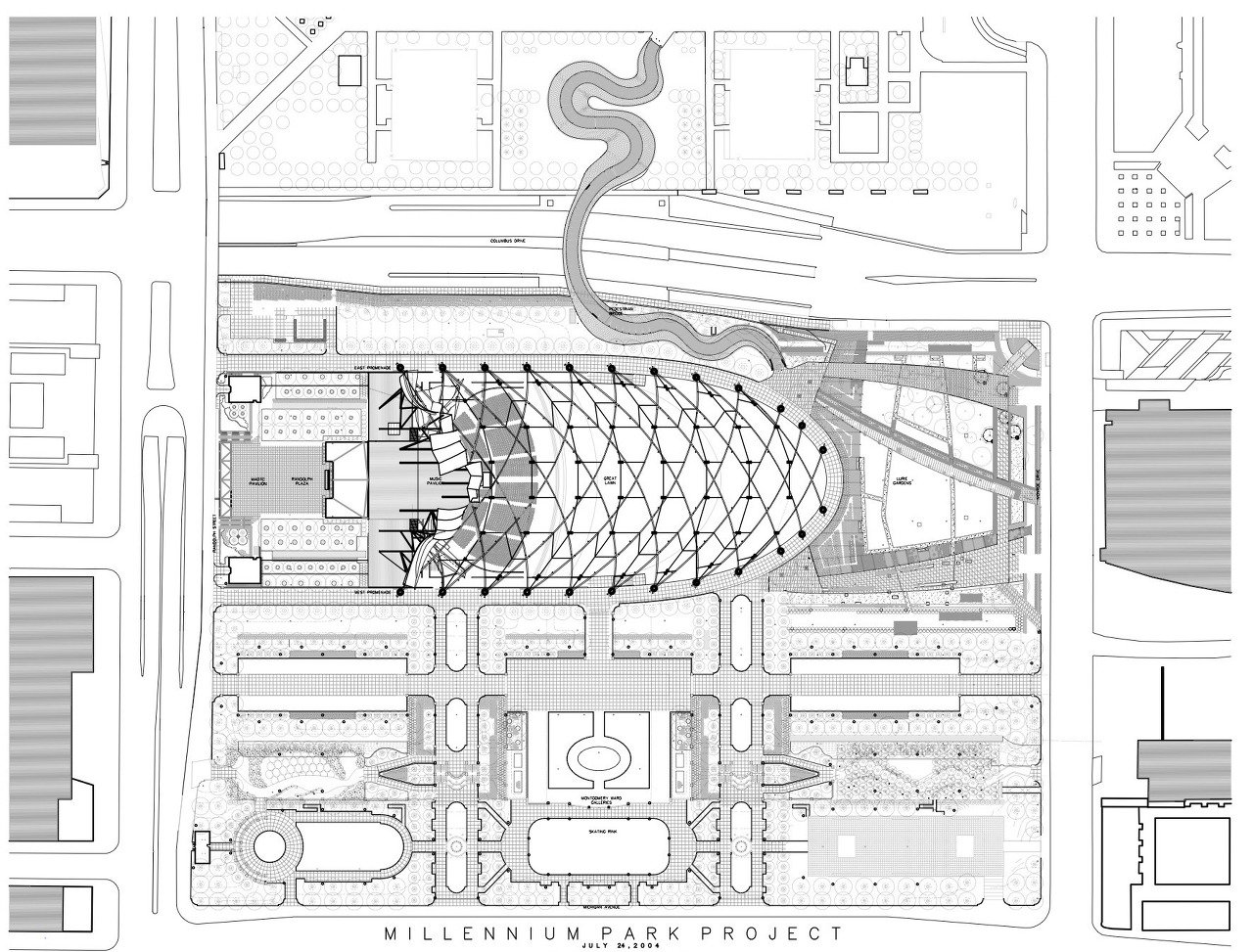 파빌리온은 3층 지하주차 구조의 꼭대기에 위치해 있다. 밀레니엄 파크와 인접한 버스 웨이와 지하철 선로가 주차 구조의 가장 낮은 층에 있는 파빌리온 아래를 지나간다. 960피트 높이의 BP 보행자 다리는 파빌리온에 인접해 있으며 콜럼버스 드라이브에 걸쳐 있으며, 밀레니엄 공원의 동쪽 부분과 매기 데일리 공원과 호수 앞과 지하 주차장과 같은 다른 요소들과 연결되어 있다.