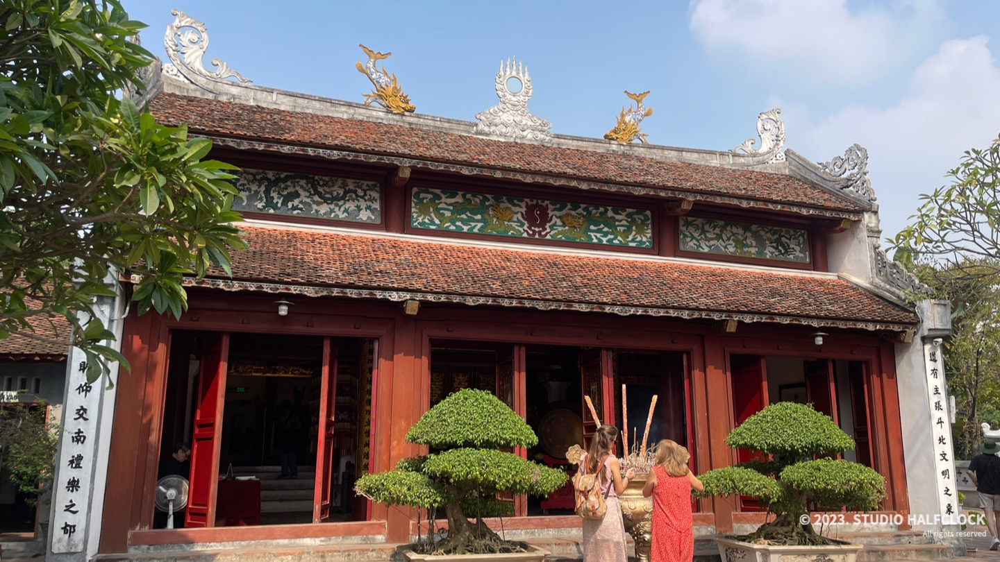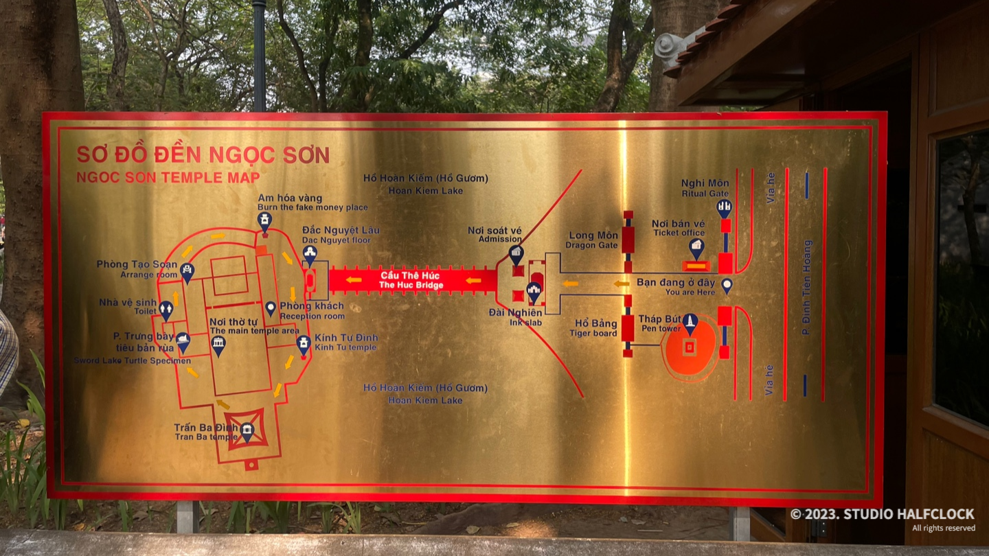 다리를 건너면 또 문처럼 생긴 게 보입니다. 여기부터 자유롭게 관람하면 되는데, 이 안에 사당(제사드리는..?)이 여러 개가 있고 이 사당은 카메라로 찍으면 안 됩니다. 생각보다 응옥썬사당이 정말 작았어요. 한 15분 만에 보고 나왔던.. 안에 화장실도 있습니다.
