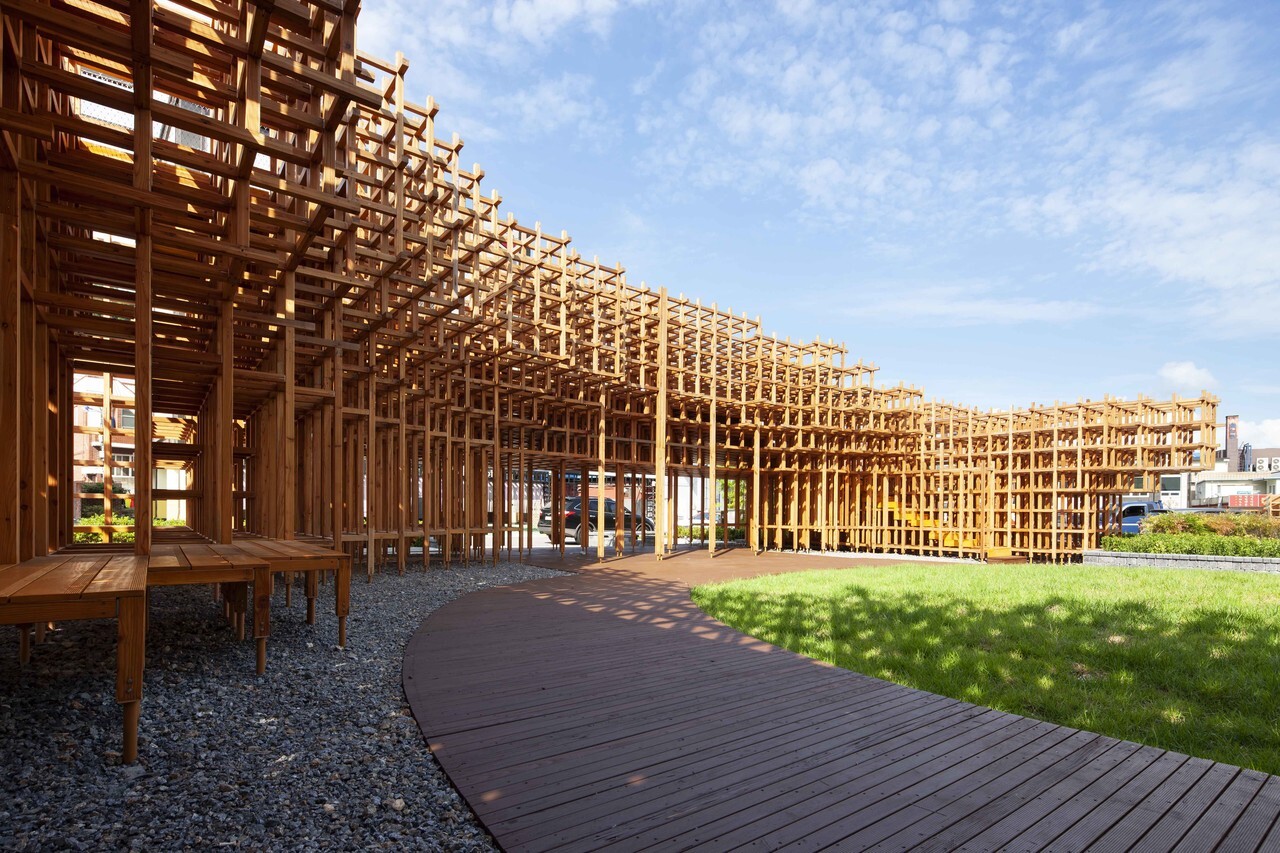 지상 1층에는 정자 안에 서로 다른 크기의 구멍이 연결되어 있어 사람들이 걷거나 쉴 수 있다. 1970년 문화원 2층 테라스와 연결되어 정자가 건물과 광장을 바로 연결한다. 첫 야외에 설치한 최초의 거대 목재 정자였기 때문에 시행착오를 겪기도 했다고 합니다. 모듈 자체는 간단하지만 두 번의 테스트를 시도하고, 설치 전 구조적 안정성을 확보했다. 이음매 방식이 독특한데, 목재가 신축되는 구조적인 문재를 방지하기 위해 2개의 모듈을 한 번에 조립했다. 3개의 빔과 기둥을 접합하기 위해 철제 커넥터와 반랩을 사용했는데, 이 철제 커넥터는 이 프로젝트를 위해 발명되었다. 목재의 특성상 외부에 있을 때 팽창, 수축, 변색이 되기 때문에 야외 공기와 햇빛에 강한 목재 얼룩을 사용하고 변형을 막기 위해 정기적으로 도색할 것을 제안했다.