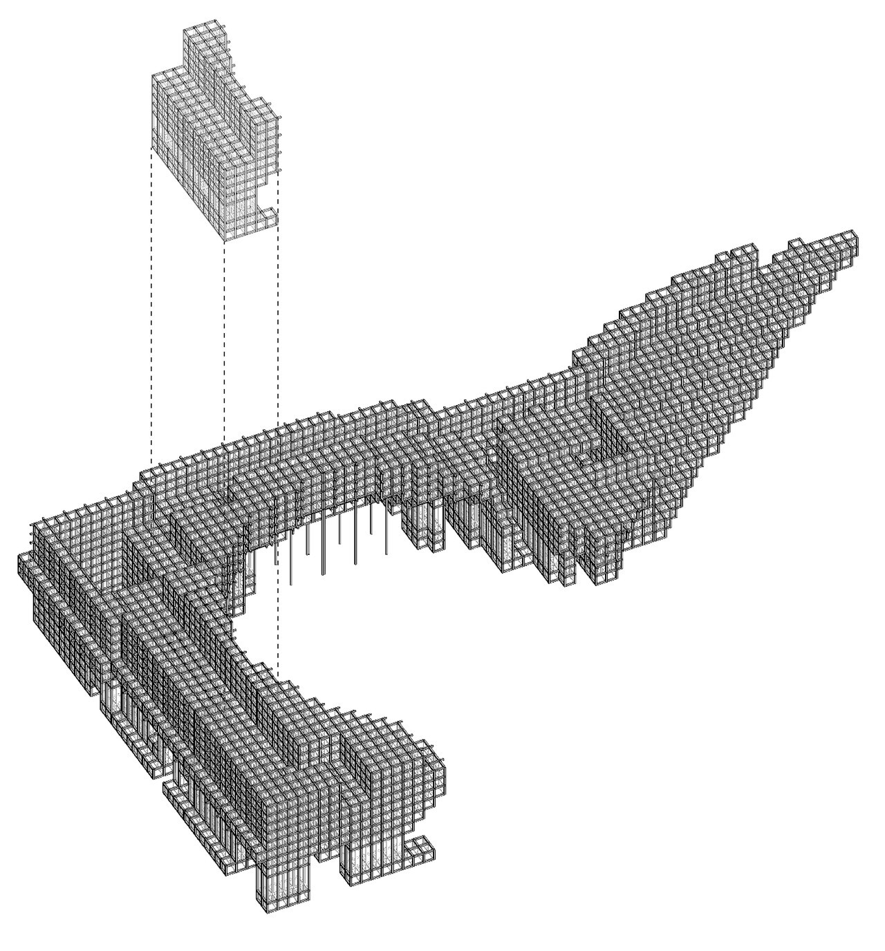IDS 건축사무소는 목재건축을 주로 다룹니다. 3차원 공간설계 (BIM)을 활용하여 입체적 사고와 실험적인 기술을 설계할 수 있다고 합니다. 45cm x 45cm x 45cm의 그리드와 현지에서 조달한 Larch를 메인 구조로 선택했다. '정자'를 생각하고 건축했는데, 이 정자는 벤치, 오솔길, 계단, 그늘 등이 될 수 있다.