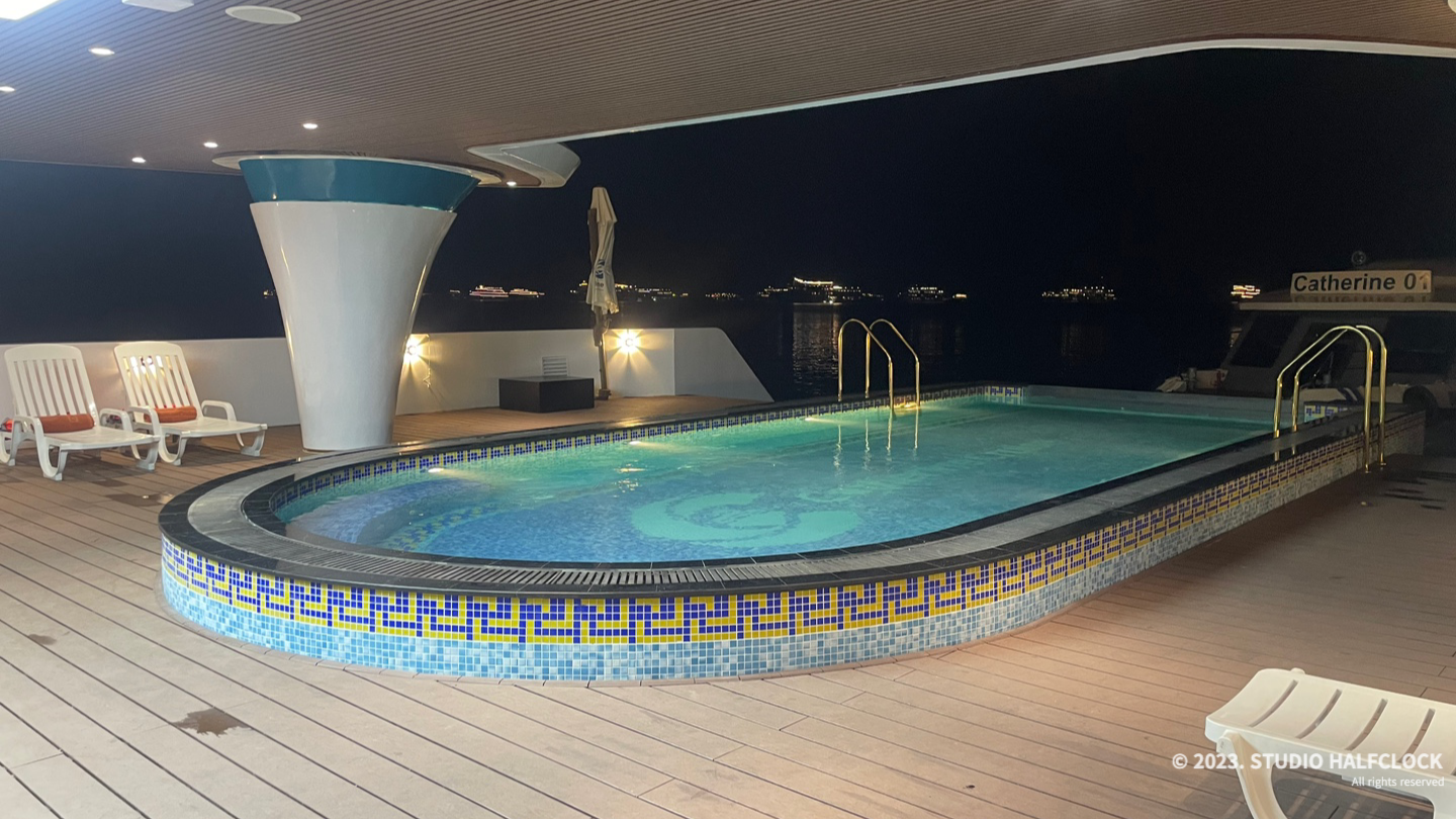 수영장은 1층 외부에 위치하는데요. 그렇게 크지는 않습니다. 다행히 제가 갔을 때 캐서린 크루즈에 탑승객이 30명 정도라서 편하게 이용했습니다. 사람이 많다면 붐빌 수 있을 것 같아요. 24시간 온수풀로 따뜻하게 이용가능합니다. 더운데 웬 온수풀인가 싶은데 제가 여행할 때는 그렇게 덥지 않았어요. 23도 정도? 그래서 온수풀이 정말 좋았습니다.