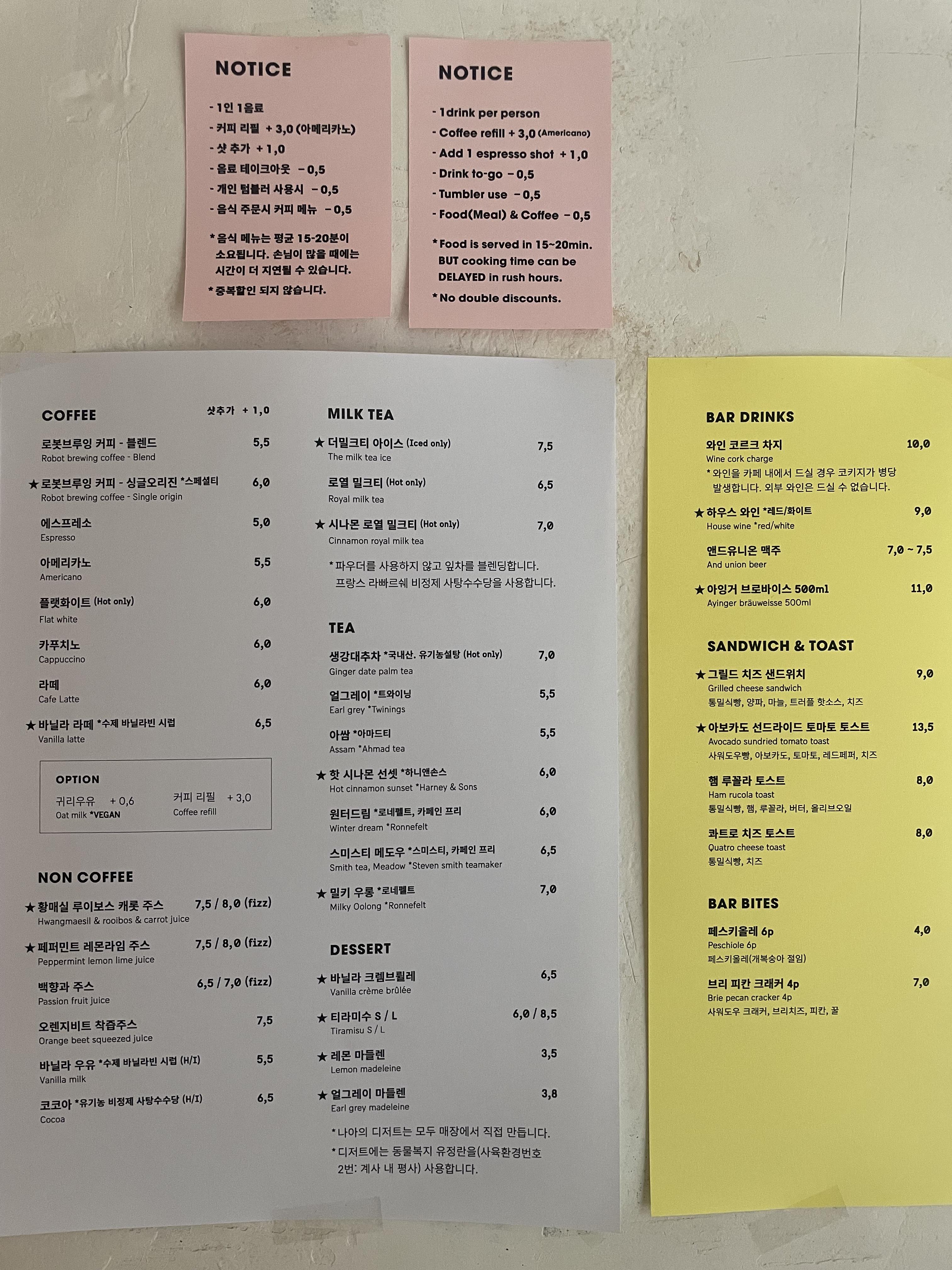 모든 디저트는 매장 내에서 직접 만든다고 한다. 개인 카페들은 디저트를 사서 진열하는 경우도 많다고 하는데, 아마 그런 이유때문에 모든 디저트를 직접 만든다고 문구를 적어놓은것 같다.