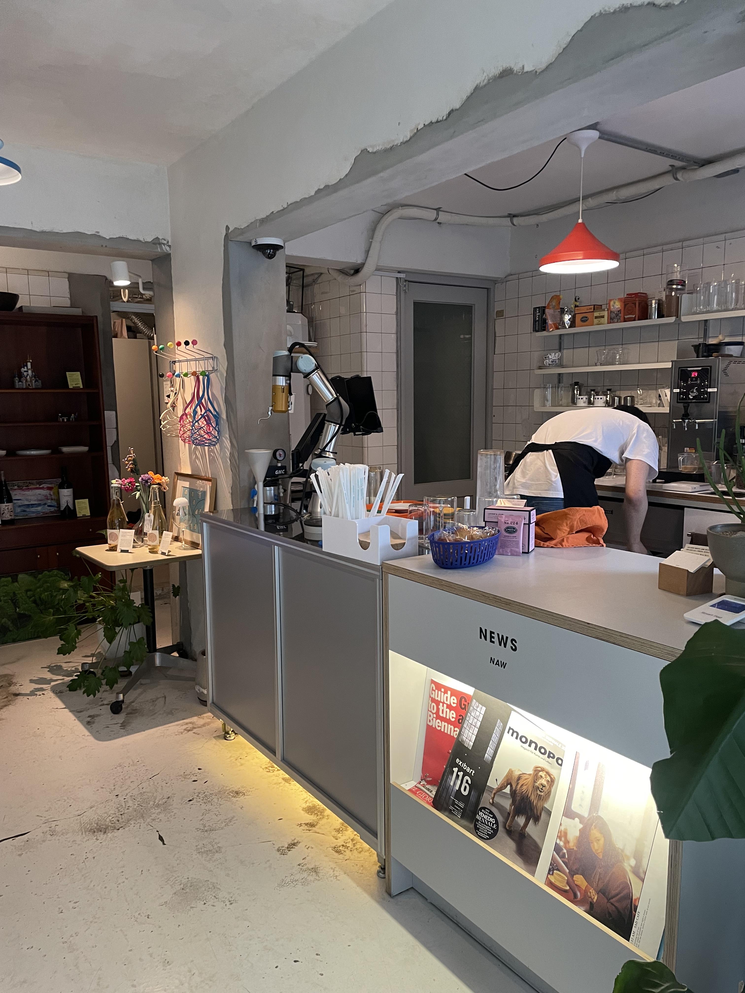 인테리어는 전체적으로 화이트 톤으로 깔끔한데 컬러풀한 가구나 소품으로 포인트를 줬다. 철제 선반에 다양한 소품들이 올려져 있는데, 구경하는 재미가 있다. 동네 카페느낌으로 사람들이 앉아서 책을 읽거나 노트북을 하기에 좋았다. 근데 테이블이 조금 작긴 했다.