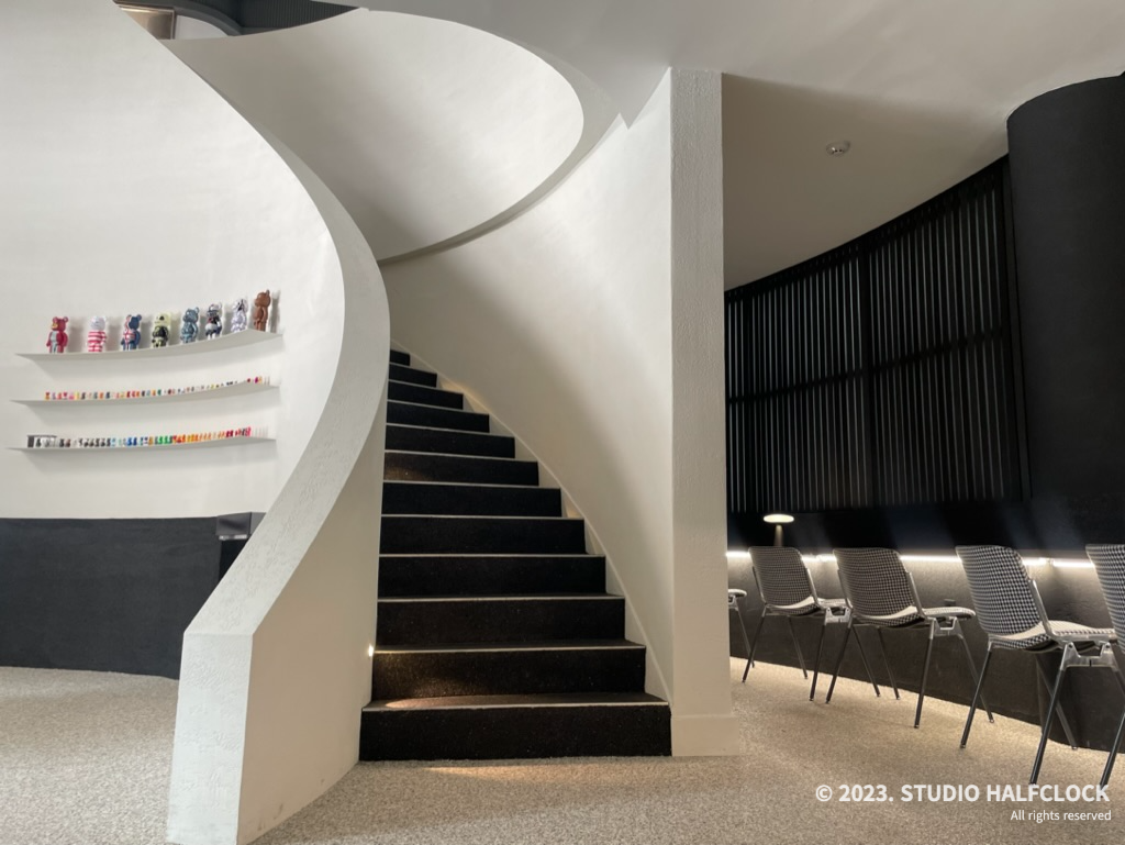 공간이 전체적으로 곡선을 이용하고, 나선형 계단으로 특이한 공간을 연출했다.