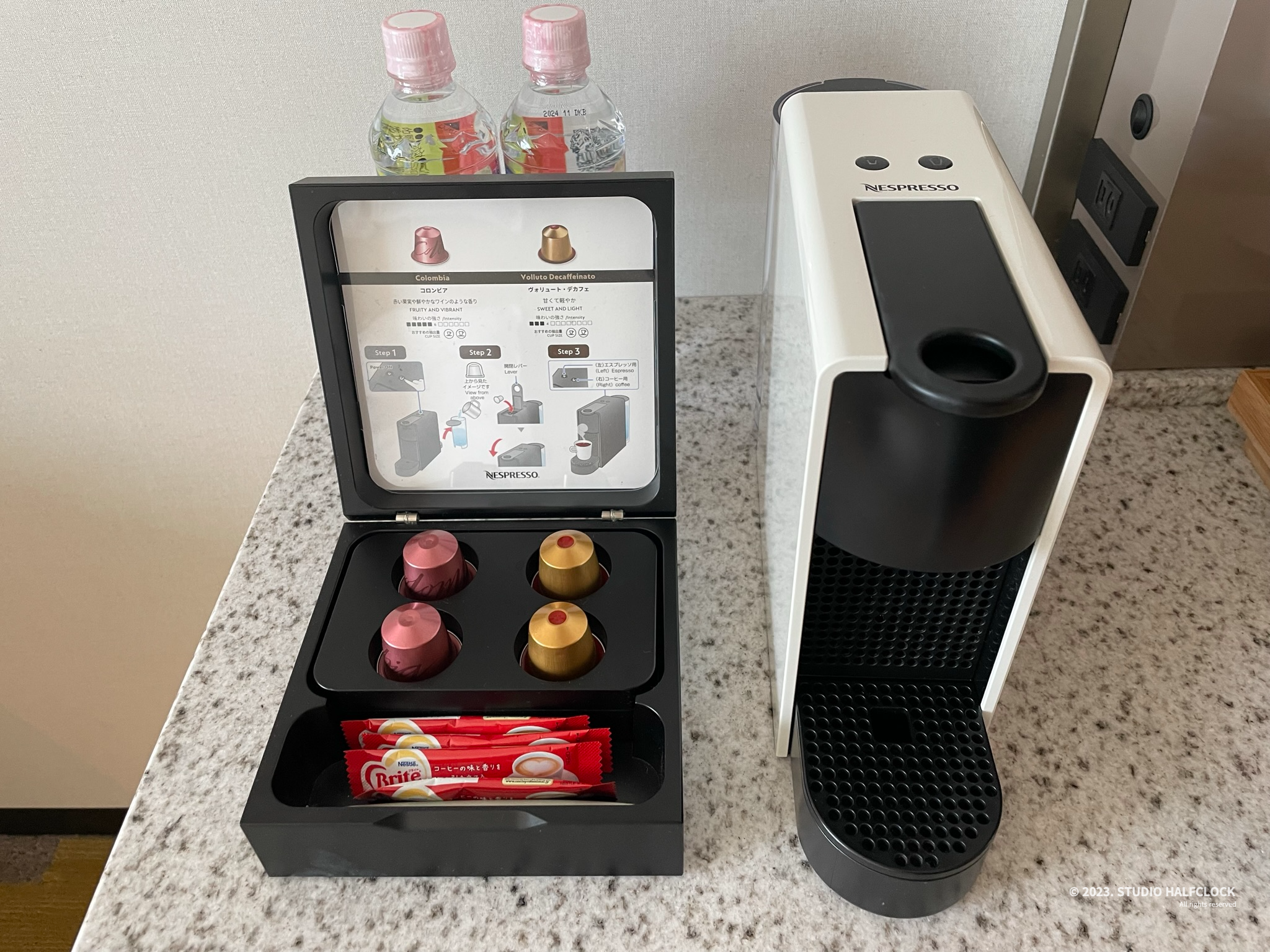 캡슐 커피머신인데 왼쪽 캡슐은 카페인 있는 거고 오른쪽 캡슐은 디카페인이었다.