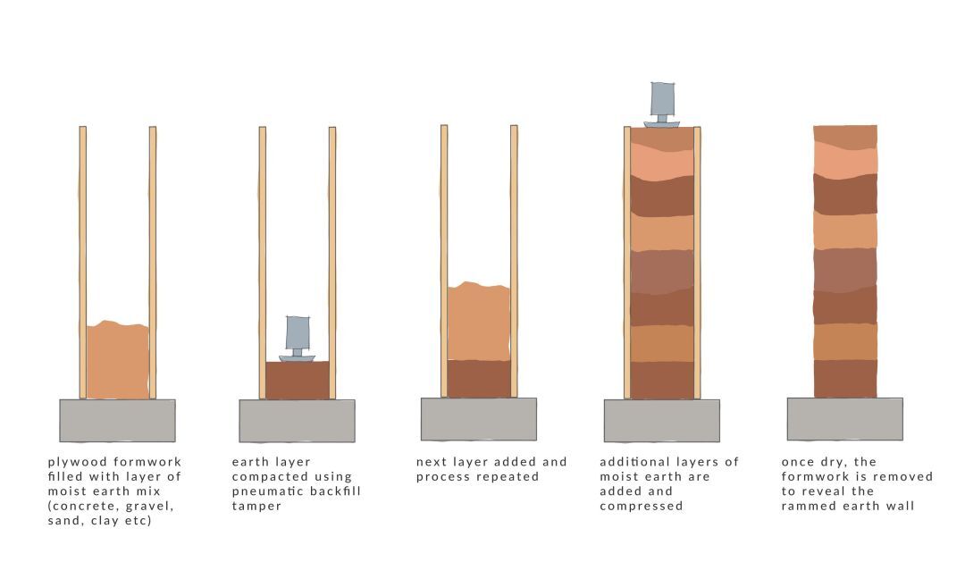 우선 그 위치가 가능하다고 판단된다면, 벽의 골조를 세울 수 있다. 일반적으로 두 개의 평행한 합판 패널로 구성된 프레임은 모래, 자갈, 점토 및 안정제를 포함하는 흙 층으로 채워진다. 그 후 공압 변조기를 사용하여 원래의 부피의 약 절반으로 압축시킨다. 이 과정은 프레임이 압축된 흙으로 채워질 때까지 반복적으로 진행되며, 목재를 제거하면 흙벽이 완성된다.