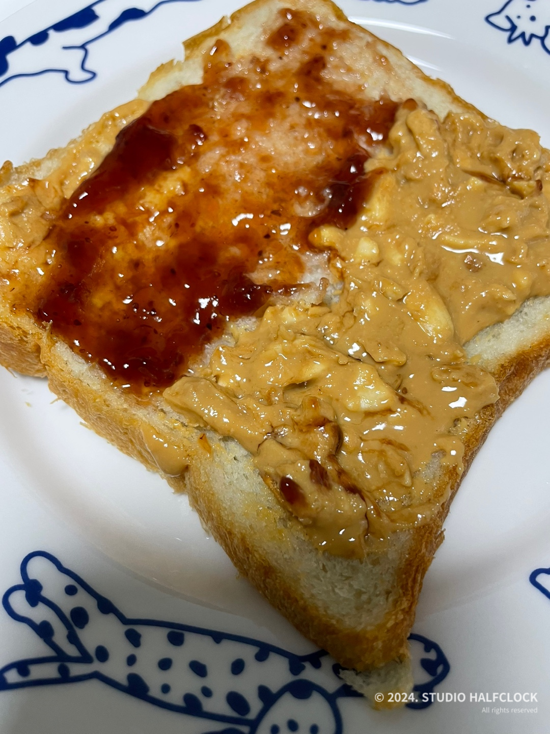 피넛버터젤리로 먹어보라니 도전! 어릴 때 이후로 안 먹어봤던 피넛버터젤리. 오랜만에 먹어도 정말 맛있더라고요. 크런치가 제형이 잘 안 발려서 나중에 스무스 발라먹을 때 진짜 편했어요. 저는 스무스가 더 맛있었어요. 저렇게 반반 바르고 접어서 먹었어요.