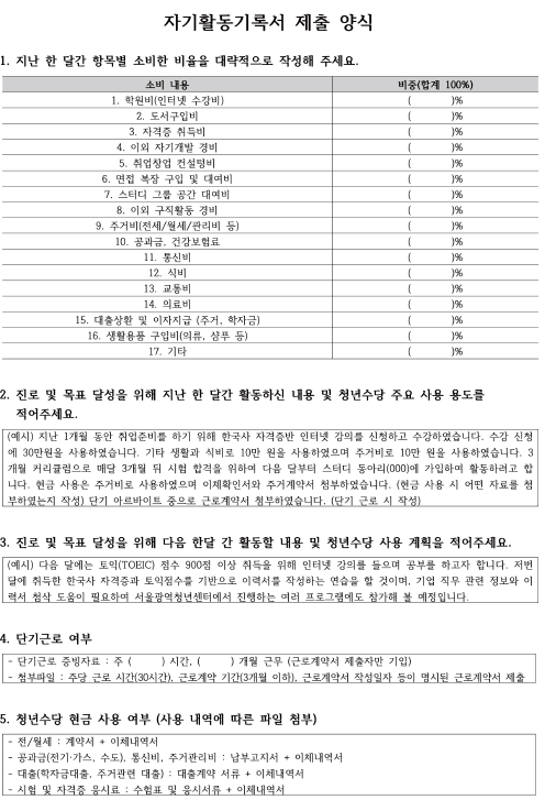 당월 15일~10일에 작성해야 하는 자기 활동기록서를 제출하지 않으면 청년수당 지급이 중단되니 꼭 작성해서 제출해야 합니다. (예외 인정 없으며, 기간 연장 없습니다)