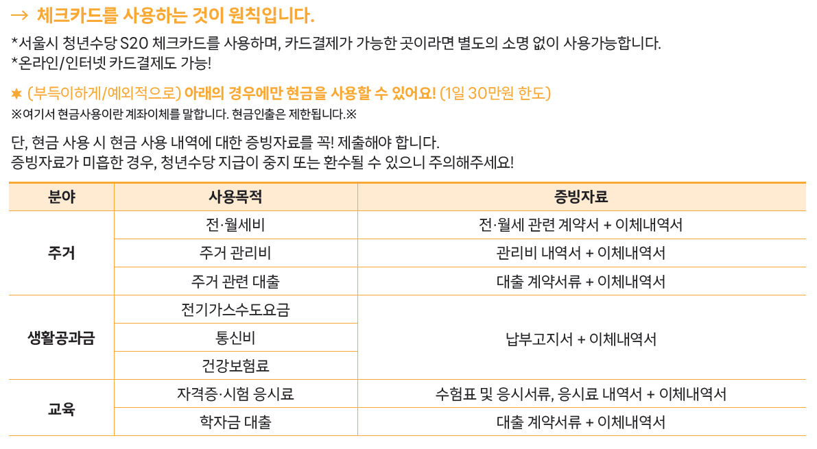 2024년도 서울시 청년수당에 선정 후, 필수이행사항을 다 하셨다면 4월 29일 첫 청년수당이 들어옵니다. 1회 차 청년수당으로 매월 29일(공휴일이면 그전이나 후) 들어온다고 생각하시면 됩니다. 그렇다면 청년수당을 어디에 쓸수 있는지, 쓰면 안 되는 곳이 있는지 자세히 알아봅시다!