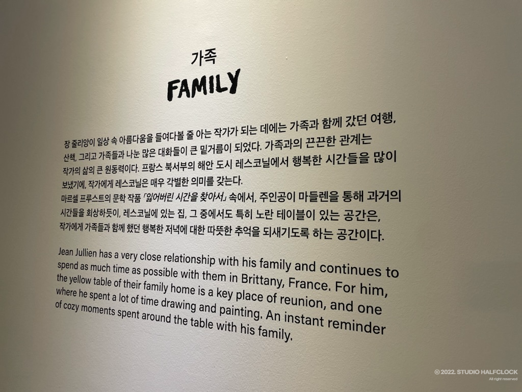 장 줄리앙이 가족과 함께 갔던 여행, 산책, 가족들과 나눈 많은 대화들을 표현한 작품이다. 가족과의 끈끈한 관계가 작가의 삶의 큰 원동력이 되었다.