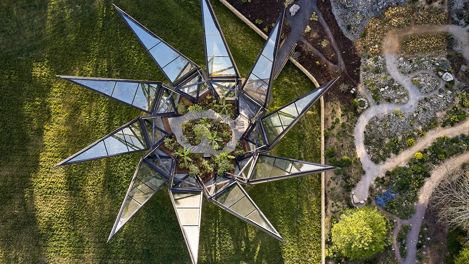 외부는 유리와 알루미늄의 10개의 강철 꽃받침으로 구성되어있다. 닫혀있을 때는 보석같은 꽃봉오리 형태를 보이고 열리면 왕관 형태의 공간이 만들어진다. 유리하우스 디자인은 빅토리아 시대의 장식인 'Victorian ornamental Terrarium'에서 영감을 받았다고 한다.