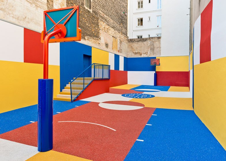 프랑스 도심의 건축물들과는 대비되는 비비드 한 컬러를 통해 농구코트가 하나의 작품으로 보인다.