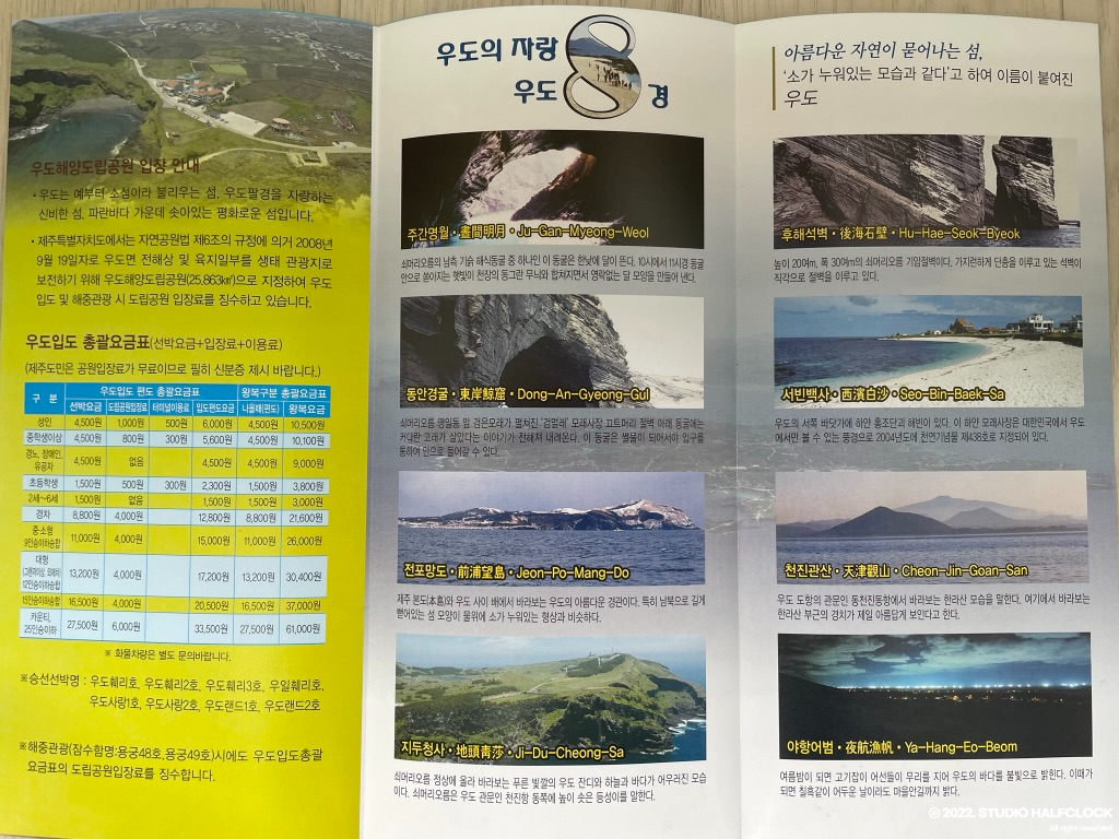 제주도의 부속 섬들 중 가장 면적이 넓다는 섬이다. 섬의 모양이 소가 누워있는 모습과 같다고 하여 이름이 '우도'라고 붙여졌다. 봄에 오면 노란색 꽃밭과 대비되는 파란색 바다, 검은색 담을 볼 수 있는 아름다운 섬이라고 한다. 본인은 11월에 가서 사실 예쁜 꽃은 보지 못했지만 멋있는 절벽과 바다를 볼 수 있어 좋았다. 우도는 땅콩으로 유명한데, 땅콩 아이스크림과 땅콩 아이스크림 라테가 맛있다. 본인은 가족들 줄 땅콩 관련 기념품을 샀다. 해물 짜장면 짬뽕부터 해물 라면 등 맛집도 굉장히 많다. 점심때 우도 방문을 추천한다. 나름의 팁이라면 바람이 진짜 굉장하게 불기에 바람막이는 필수다. 머리가 긴 여성분은 무조건 머리끈 필수!